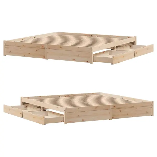 Zagotovite si boljši spanec s tem posteljnim okvirjem! Je prijeten dodatek za vsako spalnico. Stabilen in dolgotrajen okvir: Trdna borovina je znana po svoji trdnosti in trajnosti. Ravni vzorci in značilni vozli prispevajo k njenemu rustikalnemu čaru.Podnožje z letvami za optimalno podporo: Za podporo in zračnost ležišča je posteljni okvir opremljen z letvenim dnom.Popolnoma izkoriščen prostor: Ta posteljni okvir ima spodaj dva predala, ki omogočata shranjevanje predmetov, kot so dodatna posteljnina, sezonska oblačila in igrače.Preprosto manevriranje: Ta predal za shranjevanje pod posteljo ima štiri kolesa, ki zagotavljajo gladko in lahkotno manevriranje pri drsenju pod posteljo in izpod nje. Dobro je vedeti:Vzmetnica ni priložena tej postelji. Ponujamo različno izbiro ležišč. V naši trgovini si lahko ogledate ustrezne vzmetnice.Material: Trdna borovina (neobdelana)Potrebno sestavljanje: DaPostelja:Dimenzije: 205,5 x 185,5 x 31 cm (D x Š x V)Višina spalnega prostora, merjena od tal: 31 cmVišina prostora pod posteljo: 21 cmVelikost primerne vzmetnice: 180 x 200 cm (Š x D) (vzmetnica ni priložena)Največja nosilnost (z ležiščem): 100 kgZ letvenim podomPredal:Zunanje dimenzije: 95 x 55 x 17 cm (Š x G x V)Notranje dimenzije: 86,5 x 52,5 x 10 cm (Š x G x V)Maks. nosilnost (vsaka): 20 kgS štirimi kolesiPaket vsebuje:1 x Posteljni okvir z letvenim podnožjem2 x Predal 3301668