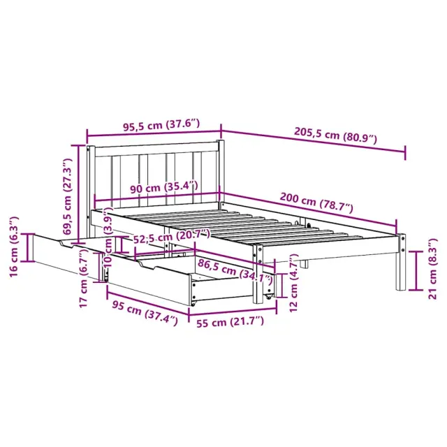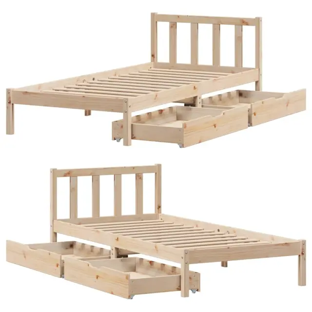 Zagotovite si boljši spanec s tem posteljnim okvirjem! Je prijeten dodatek za vsako spalnico. Stabilen in dolgotrajen okvir: Trdna borovina je znana po svoji trdnosti in trajnosti. Ravni vzorci in značilni vozli prispevajo k njenemu rustikalnemu čaru.Podnožje z letvami za optimalno podporo: Za podporo in zračnost ležišča je posteljni okvir opremljen z letvenim dnom.Popolnoma izkoriščen prostor: Ta posteljni okvir ima spodaj dva predala, ki omogočata shranjevanje predmetov, kot so dodatna posteljnina, sezonska oblačila in igrače.Preprosto manevriranje: Ta predal za shranjevanje pod posteljo ima štiri kolesa, ki zagotavljajo gladko in lahkotno manevriranje pri drsenju pod posteljo in izpod nje. Dobro je vedeti:Vzmetnica ni priložena tej postelji. Ponujamo različno izbiro ležišč. V naši trgovini si lahko ogledate ustrezne vzmetnice.Material: Trdna borovina (neobdelana)Potrebno sestavljanje: DaPostelja:Dimenzije: 205,5 x 95,5 x 69,5 cm (D x Š x V)Višina spalnega prostora, merjena od tal: 31 cmVišina prostora pod posteljo: 21 cmVelikost primerne vzmetnice: 90 x 200 cm (Š x D) (vzmetnica ni priložena)Največja nosilnost (z ležiščem): 100 kgZ letvenim podomPredal:Zunanje dimenzije: 95 x 55 x 17 cm (Š x G x V)Notranje dimenzije: 86,5 x 52,5 x 10 cm (Š x G x V)Maks. nosilnost (vsaka): 20 kgS štirimi kolesiPaket vsebuje:1 x Posteljni okvir z letvenim podnožjem2 x Predal 3301469