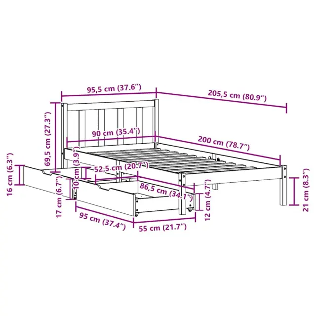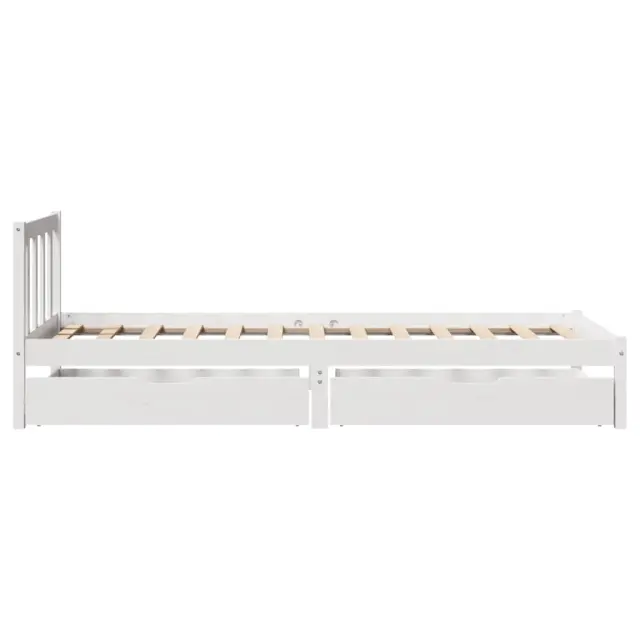 Zagotovite si boljši spanec s tem posteljnim okvirjem! Je prijeten dodatek za vsako spalnico. Stabilen in dolgotrajen okvir: Trdna borovina je znana po svoji trdnosti in trajnosti. Ravni vzorci in značilni vozli prispevajo k njenemu rustikalnemu čaru.Podnožje z letvami za optimalno podporo: Za podporo in zračnost ležišča je posteljni okvir opremljen z letvenim dnom.Popolnoma izkoriščen prostor: Ta posteljni okvir ima spodaj dva predala, ki omogočata shranjevanje predmetov, kot so dodatna posteljnina, sezonska oblačila in igrače.Preprosto manevriranje: Ta predal za shranjevanje pod posteljo ima štiri kolesa, ki zagotavljajo gladko in lahkotno manevriranje pri drsenju pod posteljo in izpod nje. Dobro je vedeti:Vzmetnica ni priložena tej postelji. Ponujamo različno izbiro ležišč. V naši trgovini si lahko ogledate ustrezne vzmetnice.Barva: BelaMaterial: Trdna borovinaPotrebno sestavljanje: DaPostelja:Dimenzije: 205,5 x 95,5 x 69,5 cm (D x Š x V)Višina spalnega prostora, merjena od tal: 31 cmVišina prostora pod posteljo: 21 cmVelikost primerne vzmetnice: 90 x 200 cm (Š x D) (vzmetnica ni priložena)Največja nosilnost (z ležiščem): 100 kgZ letvenim podomPredal:Zunanje dimenzije: 95 x 55 x 17 cm (Š x G x V)Notranje dimenzije: 86,5 x 52,5 x 10 cm (Š x G x V)Maks. nosilnost (vsaka): 20 kgS štirimi kolesiPaket vsebuje:1 x Posteljni okvir z letvenim podnožjem2 x Predal 3301470