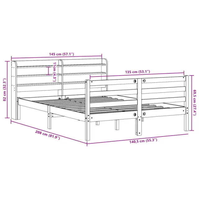 Zagotovite si boljši spanec s tem posteljnim okvirjem! Je prijeten dodatek za vsako spalnico. Stabilen in dolgotrajen okvir: Trdna borovina je znana po svoji trdnosti in trajnosti. Ravni vzorci in značilni vozli prispevajo k njenemu rustikalnemu čaru.Podnožje z letvami za optimalno podporo: Za podporo in zračnost ležišča je posteljni okvir opremljen z letvenim dnom.Veliko prostora za shranjevanje: To elegantno vzglavje ima tri priročne police, ki ponujajo veliko prostora za shranjevanje, da bodo vaše večerne potrebščine na dosegu roke.Samostoječe vzglavje: Samostoječe vzglavje ponuja brezskrbno rešitev za enostavno postavitev in premikanje brez potrebe po vgradnji na steno. Dobro je vedeti:Vzmetnica ni priložena tej postelji. Ponujamo različno izbiro ležišč. V naši trgovini si lahko ogledate ustrezne vzmetnice.Barva: Voščeno rjavaMaterial: Trdna borovinaMaterial letvic: Vezan lesCelotne dimenzije: 208 x 145 x 82 cm (D x Š x V)Velikost primerne vzmetnice: 135 x 190 cm (Š x D) (vzmetnica ni priložena)S policami za shranjevanjePotrebno sestavljanje: Da Paket vsebuje:1 x Posteljni okvir1 x Vzglavje 3306658