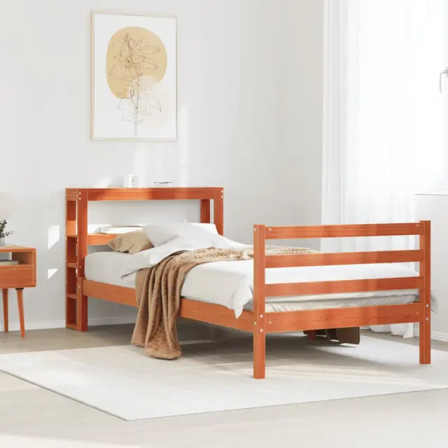 Zagotovite si boljši spanec s tem posteljnim okvirjem! Je prijeten dodatek za vsako spalnico. Stabilen in dolgotrajen okvir: Trdna borovina je znana po svoji trdnosti in trajnosti. Ravni vzorci in značilni vozli prispevajo k njenemu rustikalnemu čaru.Podnožje z letvami za optimalno podporo: Za podporo in zračnost ležišča je posteljni okvir opremljen z letvenim dnom.Veliko prostora za shranjevanje: To elegantno vzglavje ima dve priročni polici, ki ponujata veliko prostora za shranjevanje, da bodo vaše večerne potrebščine na dosegu roke.Samostoječe vzglavje: Samostoječe vzglavje ponuja brezskrbno rešitev za enostavno postavitev in premikanje brez potrebe po vgradnji na steno. Dobro je vedeti:Vzmetnica ni priložena tej postelji. Ponujamo različno izbiro ležišč. V naši trgovini si lahko ogledate ustrezne vzmetnice.Barva: Voščeno rjavaMaterial: Trdna borovinaMaterial letvic: Vezan lesCelotne dimenzije: 214,5 x 96 x 82 cm (D x Š x V)Velikost primerne vzmetnice: 90 x 190 cm (Š x D) (vzmetnica ni priložena)S policami za shranjevanjePotrebno sestavljanje: Da Paket vsebuje:1 x Posteljni okvir1 x Vzglavje 3305837