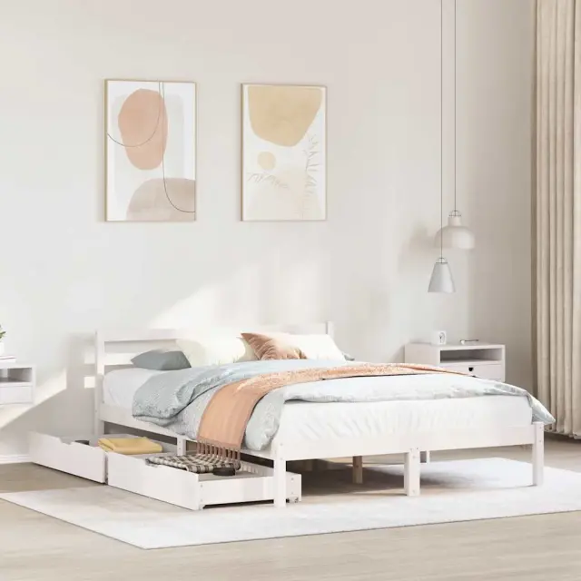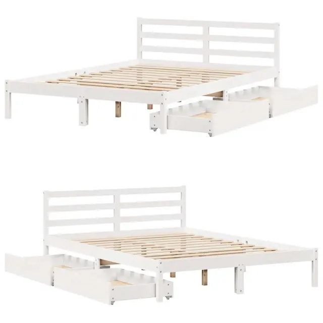 Zagotovite si boljši spanec s tem posteljnim okvirjem! Je prijeten dodatek za vsako spalnico. Stabilen in dolgotrajen okvir: Trdna borovina je znana po svoji trdnosti in trajnosti. Ravni vzorci in značilni vozli prispevajo k njenemu rustikalnemu čaru.Podnožje z letvami za optimalno podporo: Za podporo in zračnost ležišča je posteljni okvir opremljen z letvenim dnom.Popolnoma izkoriščen prostor: Ta posteljni okvir ima spodaj dva predala, ki omogočata shranjevanje predmetov, kot so dodatna posteljnina, sezonska oblačila in igrače.Preprosto manevriranje: Ta predal za shranjevanje pod posteljo ima štiri kolesa, ki zagotavljajo gladko in lahkotno manevriranje pri drsenju pod posteljo in izpod nje. Dobro je vedeti:Vzmetnica ni priložena tej postelji. Ponujamo različno izbiro ležišč. V naši trgovini si lahko ogledate ustrezne vzmetnice.Barva: BelaMaterial: Trdna borovinaPotrebno sestavljanje: DaPostelja:Dimenzije: 205,5 x 155,5 x 69,5 cm (D x Š x V)Višina spalnega prostora, merjena od tal: 31 cmVišina prostora pod posteljo: 21 cmVelikost primerne vzmetnice: 150 x 200 cm (Š x D) (vzmetnica ni priložena)Največja nosilnost (z ležiščem): 100 kgZ letvenim podomPredal:Zunanje dimenzije: 95 x 55 x 17 cm (Š x G x V)Notranje dimenzije: 86,5 x 52,5 x 10 cm (Š x G x V)Maks. nosilnost (vsaka): 20 kgS štirimi kolesiPaket vsebuje:1 x Posteljni okvir z letvenim podnožjem2 x Predal 3301543