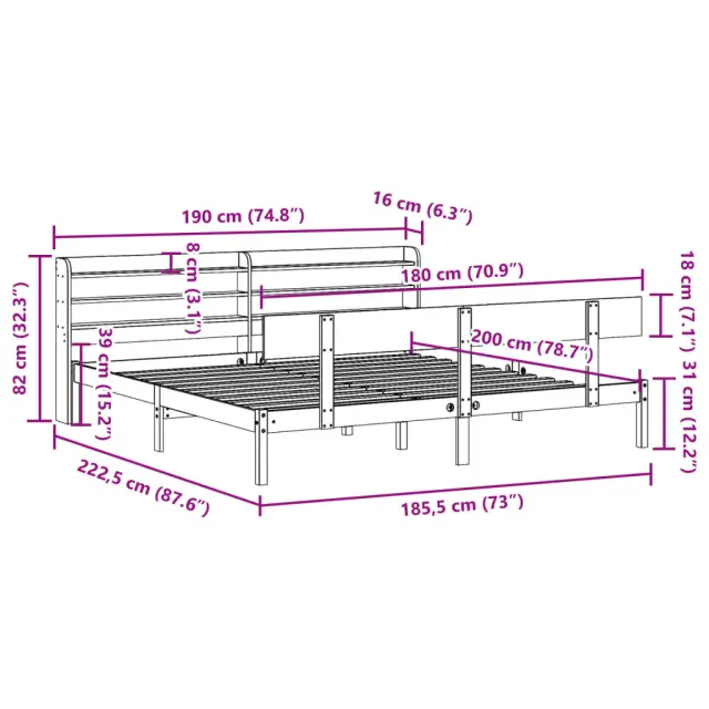 S tem lesenim posteljnim okvirjem lahko uživate v odličnem spancu! To je praktičen in dekorativen dodatek za vaše notranje prostore. Trdna borovina: Trdna borovina je čudovit naravni material. Borovina ima ravne vzorce, grče pa dajejo materialu njegov značilen, rustikalen videz.Praktične letvice: Letvice zagotavljajo dobro porazdelitev teže, kar ležišču zagotavlja prepotrebno oporo in zračnost.Veliko prostora za shranjevanje: To elegantno posteljno vzglavje ima dve priročni polici, ki ponujata veliko prostora za shranjevanje, da bodo vaše večerne potrebščine na dosegu roke.Samostoječe vzglavje: Samostoječe vzglavje ponuja brezskrbno rešitev za enostavno postavitev in premikanje brez potrebe po vgradnji na steno. Dobro je vedeti: Vzmetnica ni priložena tej postelji. Ponujamo različno izbiro ležišč. V naši trgovini si lahko ogledate ustrezne vzmetnice.Material: Trdna borovina (neobdelana)Celotne dimenzije: 222,5 x 190 x 82 cm (D x Š x V)Višina prostora pod posteljo: 21 cmVelikost primerne vzmetnice: 180 x 200 cm (Š x D) (vzmetnica ni priložena)S policami za shranjevanjePotrebno sestavljanje: Da 3306625
