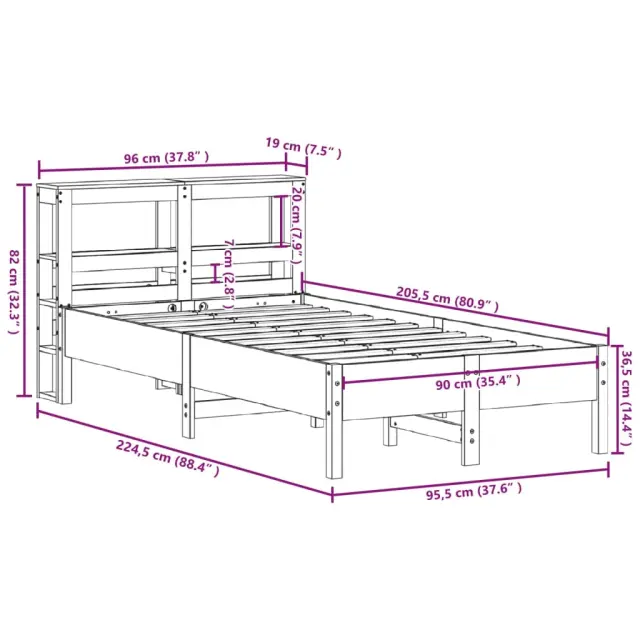 Zagotovite si boljši spanec s tem posteljnim okvirjem! Je prijeten dodatek za vsako spalnico. Stabilen in dolgotrajen okvir: Trdna borovina je znana po svoji trdnosti in trajnosti. Ravni vzorci in značilni vozli prispevajo k njenemu rustikalnemu čaru.Podnožje z letvami za optimalno podporo: Za podporo in zračnost ležišča je posteljni okvir opremljen z letvenim dnom.Vsestransko vzglavje: Ta posteljni okvir je opremljen z vzglavjem, ki zagotavlja odlično oporo hrbtu, ko sedite v postelji in berete ali gledate televizijo, hkrati pa služi tudi kot dekorativni element.Veliko prostora za shranjevanje: To elegantno vzglavje ima dve priročni polici, ki ponujata veliko prostora za shranjevanje, da bodo vaše večerne potrebščine na dosegu roke. Dobro je vedeti:Vzmetnica ni priložena tej postelji. Ponujamo različno izbiro ležišč. V naši trgovini si lahko ogledate ustrezne vzmetnice.Material posteljnega okvirja: Trdna borovina (neobdelana)Material letvic: Vezan lesCelotne dimenzije: 224,5 x 96 x 82 cm (D x Š x V)Velikost primerne vzmetnice: 90 x 200 cm (Š x D) (vzmetnica ni priložena)S policami za shranjevanjePotrebno sestavljanje: DaPaket vsebuje:1 x Posteljni okvir1 x Vzglavje 3306156