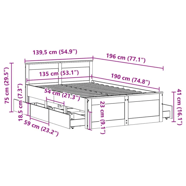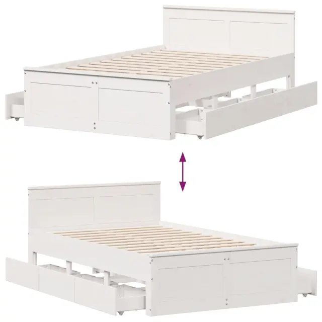 Zagotovite si boljši spanec s tem posteljnim okvirjem! Je prijeten dodatek za vsako spalnico. Stabilen in dolgotrajen okvir: Trdna borovina je znana po svoji trdnosti in trajnosti. Ravni vzorci in značilni vozli prispevajo k njenemu rustikalnemu čaru.Podnožje z letvami za optimalno podporo: Za podporo in zračnost ležišča je posteljni okvir opremljen z letvenim dnom.Stabilne in vzdržljive noge: Ta postelja je podprta z robustnimi nogami, ki zagotavljajo stabilnost, varnost in trdnost.Funkcionalno vzglavje in podnožje: Z vzglavjem lesene postelje lahko ohranite vzmetnico na mestu. Poleg tega vzglavje zagotavlja odlično oporo hrbtu, ko sedite v postelji in berete ali gledate televizijo.Funkcija shranjevanja: Ta posteljni okvir ima predale za dobro organizacijo revij, knjig, igrač in drugih manjših predmetov. Dobro je vedeti:Vzmetnica ni priložena tej postelji. Ponujamo različno izbiro ležišč. V naši trgovini si lahko ogledate ustrezne vzmetnice.Barva: BelaMaterial posteljnega okvirja: Trdna borovinaCelotne dimenzije: 196 x 139,5 x 75 cm (D x Š x V)Dimenzije predala (vsak): 59 x 37 x 18,5 cm (D x Š x V)Velikost primerne vzmetnice: 135 x 190 cm (Š x D) (vzmetnica ni priložena)Z letvenim podomPotrebno sestavljanje: Da 3308781
