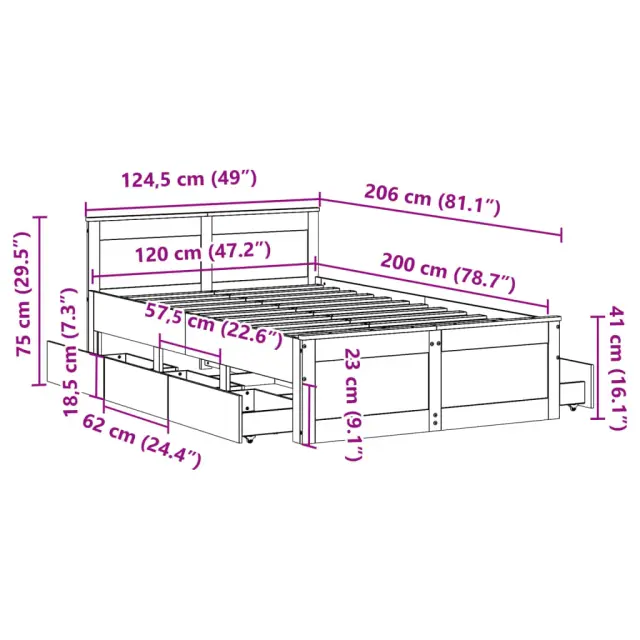 Zagotovite si boljši spanec s tem posteljnim okvirjem! Je prijeten dodatek za vsako spalnico. Stabilen in dolgotrajen okvir: Trdna borovina je znana po svoji trdnosti in trajnosti. Ravni vzorci in značilni vozli prispevajo k njenemu rustikalnemu čaru.Podnožje z letvami za optimalno podporo: Za podporo in zračnost ležišča je posteljni okvir opremljen z letvenim dnom.Stabilne in vzdržljive noge: Ta postelja je podprta z robustnimi nogami, ki zagotavljajo stabilnost, varnost in trdnost.Funkcionalno vzglavje in podnožje: Z vzglavjem lesene postelje lahko ohranite vzmetnico na mestu. Poleg tega vzglavje zagotavlja odlično oporo hrbtu, ko sedite v postelji in berete ali gledate televizijo.Funkcija shranjevanja: Ta posteljni okvir ima predale za dobro organizacijo revij, knjig, igrač in drugih manjših predmetov. Dobro je vedeti:Vzmetnica ni priložena tej postelji. Ponujamo različno izbiro ležišč. V naši trgovini si lahko ogledate ustrezne vzmetnice.Barva: Voščeno rjavaMaterial posteljnega okvirja: Trdna borovinaCelotne dimenzije: 206 x 124,5 x 75 cm (D x Š x V)Dimenzije predala (vsak): 62 x 37 x 18,5 cm (D x Š x V)Velikost primerne vzmetnice: 120 x 200 cm (Š x D) (vzmetnica ni priložena)Z letvenim podomPotrebno sestavljanje: Da 3308770
