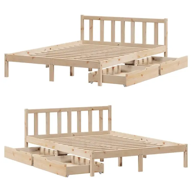Zagotovite si boljši spanec s tem posteljnim okvirjem! Je prijeten dodatek za vsako spalnico. Stabilen in dolgotrajen okvir: Trdna borovina je znana po svoji trdnosti in trajnosti. Ravni vzorci in značilni vozli prispevajo k njenemu rustikalnemu čaru.Podnožje z letvami za optimalno podporo: Za podporo in zračnost ležišča je posteljni okvir opremljen z letvenim dnom.Popolnoma izkoriščen prostor: Ta posteljni okvir ima spodaj dva predala, ki omogočata shranjevanje predmetov, kot so dodatna posteljnina, sezonska oblačila in igrače.Preprosto manevriranje: Ta predal za shranjevanje pod posteljo ima štiri kolesa, ki zagotavljajo gladko in lahkotno manevriranje pri drsenju pod posteljo in izpod nje. Dobro je vedeti:Vzmetnica ni priložena tej postelji. Ponujamo različno izbiro ležišč. V naši trgovini si lahko ogledate ustrezne vzmetnice.Material: Trdna borovina (neobdelana)Potrebno sestavljanje: DaPostelja:Dimenzije: 205,5 x 155,5 x 69,5 cm (D x Š x V)Višina spalnega prostora, merjena od tal: 31 cmVišina prostora pod posteljo: 21 cmVelikost primerne vzmetnice: 150 x 200 cm (Š x D) (vzmetnica ni priložena)Največja nosilnost (z ležiščem): 100 kgZ letvenim podomPredal:Zunanje dimenzije: 95 x 55 x 17 cm (Š x G x V)Notranje dimenzije: 86,5 x 52,5 x 10 cm (Š x G x V)Maks. nosilnost (vsaka): 20 kgS štirimi kolesiPaket vsebuje:1 x Posteljni okvir z letvenim podnožjem2 x Predal 3301477