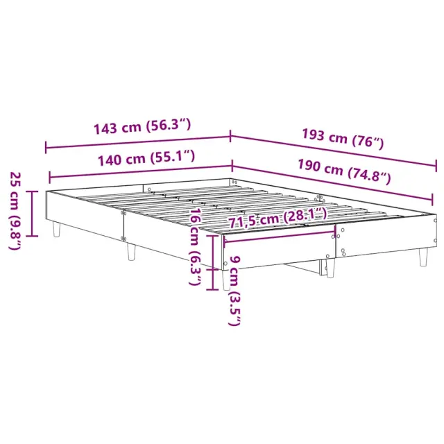Zagotovite si boljši spanec s tem posteljnim okvirjem! Je prijeten dodatek za vsako spalnico. Vzdržljiv material: Inženirski les se ponaša z izjemno kakovostjo, gladko površino ter močjo, stabilnostjo in odpornostjo na vlago.Podnožje z letvami za optimalno podporo: Za podporo in zračnost ležišča je posteljni okvir opremljen z letvenim dnom.Stabilne in vzdržljive noge: Ta postelja ima trdne noge, ki zagotavljajo stabilnost, varnost in trdnost.Dobro je vedeti:Vzmetnica ni priložena tej postelji. Ponujamo različno izbiro ležišč. V naši trgovini si lahko ogledate ustrezne vzmetnice.Barva: Dimljeni hrastMaterial posteljnega okvirja: Inženirski les, trden les evkaliptusaMaterial letvic: Vezan lesCelotne dimenzije: 193 x 143 x 25 cm (D x Š x V)Velikost primerne vzmetnice: 140 x 190 cm (Š x D) (vzmetnica ni priložena)Potrebno sestavljanje: Da 861061