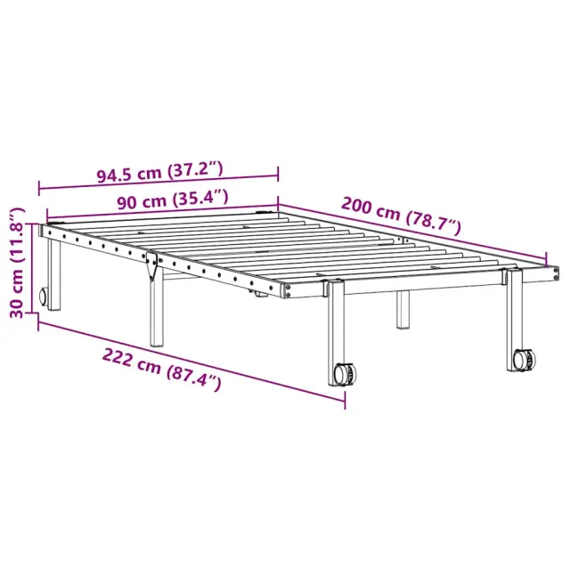 Če iščete trpežen posteljni okvir za svojo spalnico, je ta posteljni okvir z elegantno in brezčasno obliko popolna izbira za vas! Robustna konstrukcija: Okvir postelje je izdelan iz jekla, zelo trpežnega in močnega materiala, ki zagotavlja izjemno robustnost in stabilnost.Kovinski podstavek in noge z letvami: Kovinski posteljni okvir je opremljen z letvenim dnom in sredinskimi nogami, ki ležišču zagotavljajo potrebno podporo in zračnost.Zložljiva zasnova: Ta posteljni okvir je zaradi svoje zložljive zasnove zlahka zložljiv in ga je mogoče shraniti v kompaktne prostore, ko ga ne uporabljate, zato je idealen za majhne sobe ali tesne prostore.Enostavno premikanje: Ta posteljni okvir je opremljen s štirimi kolesi, ki omogočajo enostavno premikanje na poljubno lokacijo.Dodaten prostor za shranjevanje: Za vaše udobje je pod posteljo na voljo dodaten prostor za shranjevanje, ki omogoča, da se škatle za shranjevanje ne vidijo. Dobro je vedeti:Vzmetnica ni priložena tej postelji. Ponujamo različno izbiro ležišč. V naši trgovini si lahko ogledate ustrezne vzmetnice.Barva: ČrnaMaterial: JekloCelotne mere: 222 x 94,5 x 30 cm (d x š x v)Zložljive dimenzije: 94,5 x 30 x 107 cm (D x Š x V)Velikost primerne vzmetnice: 90 x 200 cm (Š x D) (vzmetnica ni priložena)Potrebno sestavljanje: Da 4103960