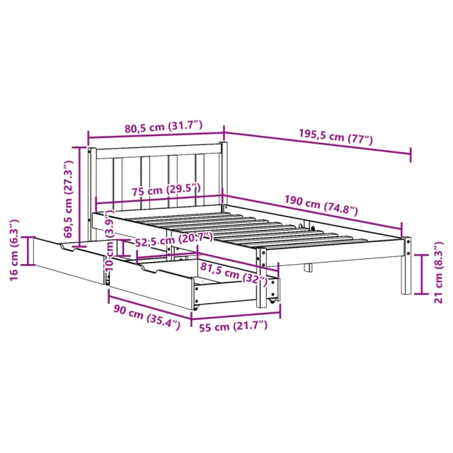 • Velikost primerne vzmetnice: 75 x 190 cm (Š x D) (vzmetnica ni priložena)