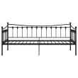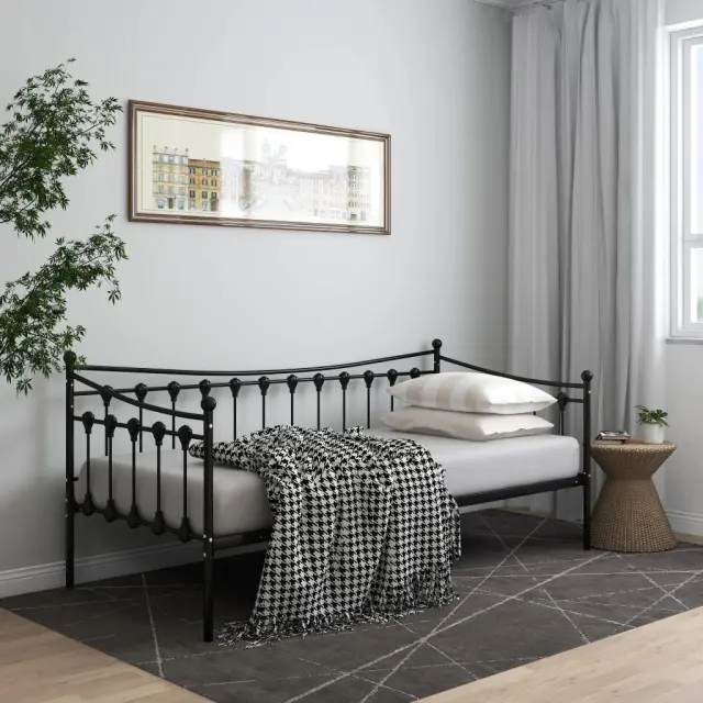 Ta trendovska zofa z ležiščem bo popolna rešitev za namestitev nepričakovanih gostov, ki bodo pri vas prespali. Hkrati bo zagotovila tudi udoben prostor za sedenje čez dan. Ta kos pohištva lahko podnevi enostavno spremenite v kavč, ponoči pa v udobno posteljo. Okvir dnevne postelje bo dobro izkoristil prostor, ki ga imate na voljo, ter zagotovil prostor za spanje, zato je popolna izbira za tiste, ki nimate veliko prostora. Poleg tega je postelja za goste opremljena z ograjico, ki bo uporabniku preprečilo, da bi se zvalil s postelje. Celoten posteljni okvir ima trdno kovinsko konstrukcijo, ki zagotavlja trpežnost in stabilnost za vsakodnevno uporabo. Prosimo, upoštevajte: Paket vsebuje samo posteljni okvir. Vzmetnica ni priložena. V trgovini si lahko ogledate primerno vzmetnico.Barva: ČrnaMaterial: Kovina s prašnim premazomDimenzije: 206 x 95 x 91,5 cm (D x Š x V)Velikost primerne vzmetnice: 200 x 90 cm (D x Š) (vzmetnica ni priložena)Potrebno sestavljanje: Da 324755