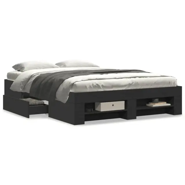 Zagotovite si boljši spanec s tem posteljnim okvirjem! Je prijeten dodatek za vsako spalnico. Vzdržljiv material: Posteljni okvir je izdelan iz inženirskega lesa. Inženirski les se ponaša z izjemno kakovostjo, gladko površino ter močjo, stabilnostjo in odpornostjo na vlago.Podnožje z letvami za optimalno podporo: Za podporo in zračnost ležišča je posteljni okvir opremljen z letvenim dnom.Funkcija shranjevanja: Ta posteljni okvir ima predale in odprte predelke za dobro organizacijo revij, knjig, igrač in drugih manjših predmetov. Dobro je vedeti:Vzmetnica ni priložena tej postelji. Ponujamo različno izbiro ležišč. V naši trgovini si lahko ogledate ustrezne vzmetnice.Barva: ČrnaMaterial posteljnega okvirja: Inženirski lesMaterial letvic: Vezan lesCelotne dimenzije: 193 x 138 x 33 cm (D x Š x V)Dimenzije predelkov (vsak): 51 x 14,5 x 10 cm (D x Š x V)Dimenzije predalov (vsak): 79,5 x 28,5 x 18 cm (D x Š x V)Velikost primerne vzmetnice: 135 x 190 cm (Š x D) (vzmetnica ni priložena)Potrebno sestavljanje: Da 3295507