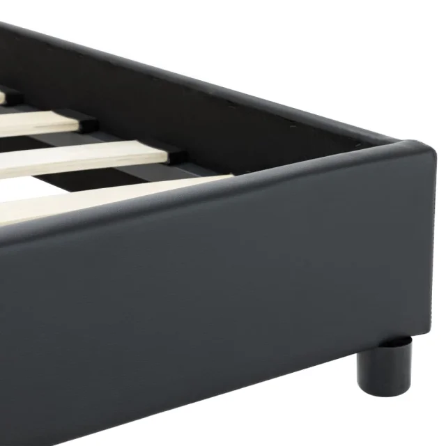 Ta posteljni okvir je prepoznaven po svojem preprostem in elegantnem dizajnu, zato bo dekorju v vaši spalnici dodal pridih elegantnega šarma. Izdelan je iz lesa in mediapana, zato je ta posteljni okvir precej trden in trpežen. Jeklene noge s prašnim premazom prispevajo k dodatni trpežnosti postelje. Poleg tega je postelja oblečena v trpežno umetno usnje, zato je zelo lepa in preprosta za čiščenje. Ta posteljni okvir je primeren za vzmetnico velikosti 90 x 200 cm.