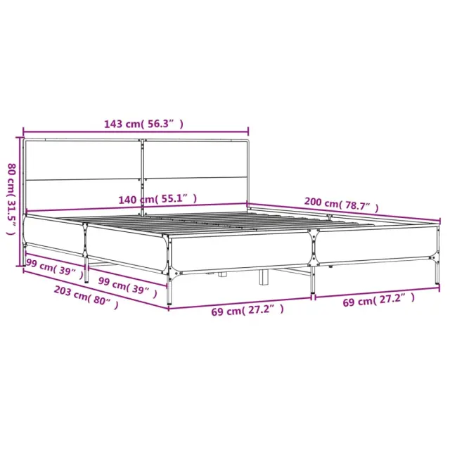 Zagotovite si boljši spanec s tem posteljnim okvirjem! Je prijeten dodatek za vsako spalnico. Vzdržljiv material: Inženirski les se ponaša z izjemno kakovostjo, gladko površino ter močjo, stabilnostjo in odpornostjo na vlago. Kovinske noge in letvice iz vezanega lesa: Okvir postelje je opremljen s kovinskimi nogami in letvicami iz vezanega lesa, ki ležišču nudijo potrebno oporo in zračnost.Odlična podpora: Vzglavje zagotavlja odlično oporo hrbtu, ko sedite v postelji in berete ali gledate televizijo. Dobro je vedeti: Vzmetnica ni priložena tej postelji. Ponujamo različno izbiro ležišč. V naši trgovini si lahko ogledate ustrezne vzmetnice.Barva: Dimljeni hrastMaterial posteljnega okvirja: Inženirski les, kovinaMaterial letvic: Vezan lesCelotne dimenzije: 203 x 143 x 80 cm (D x Š x V)Velikost primerne vzmetnice: 140 x 200 cm (Š x D) (vzmetnica ni priložena)Potrebno sestavljanje: Da 3279999
