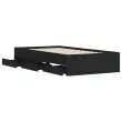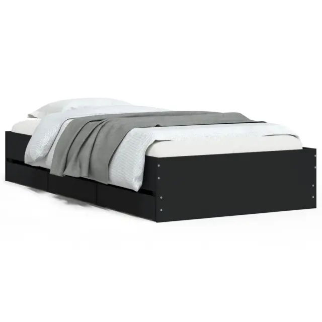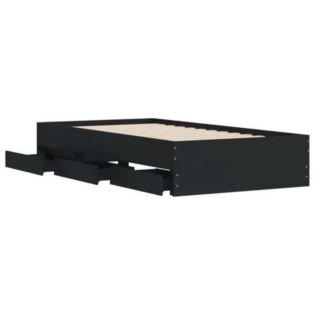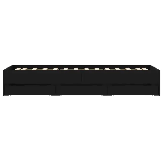 Dodajte svoji spalnici moderen pridih s tem posteljnim okvirjem s predali! Predstavlja praktičen in dekorativen dodatek za vaš bivalni prostor. Vzdržljiv material: Posteljni okvir je izdelan iz inženirskega lesa. Inženirski les se ponaša z izjemno kakovostjo, gladko površino ter močjo, stabilnostjo in odpornostjo na vlago.Trdne letvice: Letvice iz vezanega lesa omogočajo dobro porazdelitev teže in zagotavljajo, da vzmetnica ostane na mestu ob vsakem zasuku in obračanju med spanjem.Funkcija shranjevanja: Priloženi posteljni predali nudijo dovolj prostora za shranjevanje potrebščin, da bo soba čista in urejena. Dobro je vedeti:Vzmetnica ni priložena tej postelji. Ponujamo različno izbiro ležišč. V naši trgovini si lahko ogledate ustrezne vzmetnice.Barva: ČrnaMaterial posteljnega okvirja: Inženirski lesMaterial letvic: Vezan lesCelotne dimenzije: 203 x 102 x 33 cm (D x Š x V)Dimenzije predala (vsak): 65 x 30 x 15,5 cm (D x Š x V)Velikost primerne vzmetnice: 100 x 200 cm (Š x D) (vzmetnica ni priložena)Potrebno sestavljanje: DaPaket vsebuje:1 x Posteljni okvir6 x Predal 3207288