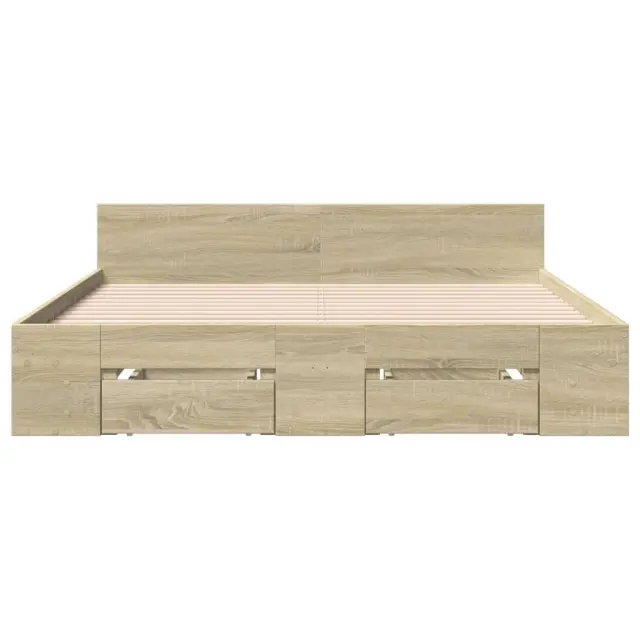 Dodajte svoji spalnici moderen pridih s tem posteljnim okvirjem s predali! Predstavlja praktičen in dekorativen dodatek za vaš bivalni prostor. Vzdržljiv material: Posteljni okvir je izdelan iz inženirskega lesa. Inženirski les se ponaša z izjemno kakovostjo, gladko površino ter močjo, stabilnostjo in odpornostjo na vlago.Trdne letvice: Letvice iz vezanega lesa omogočajo dobro porazdelitev teže in zagotavljajo, da vzmetnica ostane na mestu ob vsakem zasuku in obračanju med spanjem.Funkcija shranjevanja: Vključeni predali za posteljo in stranski predelki zagotavljajo dovolj prostora za shranjevanje najnujnejših stvari, da bo vaša soba čista in urejena. Dobro je vedeti:Vzmetnica ni priložena tej postelji. Ponujamo različno izbiro ležišč. V naši trgovini si lahko ogledate ustrezne vzmetnice.Barva: Sonoma hrastMaterial posteljnega okvirja: Inženirski lesMaterial letvic: Vezan lesCelotne dimenzije: 193 x 138 x 45 cm (D x Š x V)Velikost primerne vzmetnice: 135 x 190 cm (Š x D) (vzmetnica ni priložena)Dimenzije predalov za posteljo: 38,5 x 33,5 x 12 cm (D x Š x V)Potrebno sestavljanje: DaPaket vsebuje:1 x Posteljni okvir2 x Posteljni predal 3280771