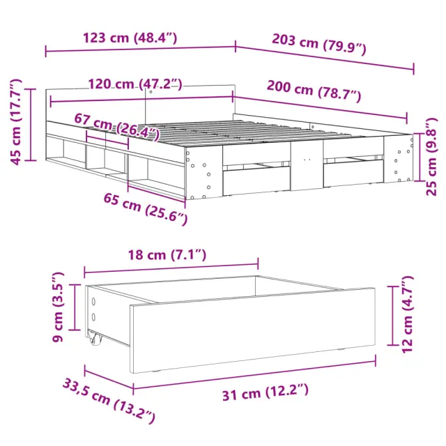 Dodajte svoji spalnici moderen pridih s tem posteljnim okvirjem s predali! Predstavlja praktičen in dekorativen dodatek za vaš bivalni prostor. Vzdržljiv material: Posteljni okvir je izdelan iz inženirskega lesa. Inženirski les se ponaša z izjemno kakovostjo, gladko površino ter močjo, stabilnostjo in odpornostjo na vlago.Trdne letvice: Letvice iz vezanega lesa omogočajo dobro porazdelitev teže in zagotavljajo, da vzmetnica ostane na mestu ob vsakem zasuku in obračanju med spanjem.Funkcija shranjevanja: Vključeni predali za posteljo in stranski predelki zagotavljajo dovolj prostora za shranjevanje najnujnejših stvari, da bo vaša soba čista in urejena. Dobro je vedeti:Vzmetnica ni priložena tej postelji. Ponujamo različno izbiro ležišč. V naši trgovini si lahko ogledate ustrezne vzmetnice.Barva: Sonoma hrastMaterial posteljnega okvirja: Inženirski lesMaterial letvic: Vezan lesCelotne dimenzije: 203 x 123 x 45 cm (D x Š x V)Velikost primerne vzmetnice: 120 x 200 cm (Š x D) (vzmetnica ni priložena)Dimenzije predalov za posteljo (vsak): 31 x 33,5 x 12 cm (D x Š x V)Potrebno sestavljanje: DaPaket vsebuje:1 x Posteljni okvir2 x Posteljni predal 3280757