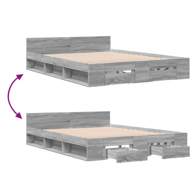 Dodajte svoji spalnici moderen pridih s tem posteljnim okvirjem s predali! Predstavlja praktičen in dekorativen dodatek za vaš bivalni prostor. Vzdržljiv material: Posteljni okvir je izdelan iz inženirskega lesa. Inženirski les se ponaša z izjemno kakovostjo, gladko površino ter močjo, stabilnostjo in odpornostjo na vlago.Trdne letvice: Letvice iz vezanega lesa omogočajo dobro porazdelitev teže in zagotavljajo, da vzmetnica ostane na mestu ob vsakem zasuku in obračanju med spanjem.Funkcija shranjevanja: Vključeni predali za posteljo in stranski predelki zagotavljajo dovolj prostora za shranjevanje najnujnejših stvari, da bo vaša soba čista in urejena. Dobro je vedeti:Vzmetnica ni priložena tej postelji. Ponujamo različno izbiro ležišč. V naši trgovini si lahko ogledate ustrezne vzmetnice.Barva: Siva sonomaMaterial posteljnega okvirja: Inženirski lesMaterial letvic: Vezan lesCelotne dimenzije: 193 x 138 x 45 cm (D x Š x V)Velikost primerne vzmetnice: 135 x 190 cm (Š x D) (vzmetnica ni priložena)Dimenzije predalov za posteljo: 38,5 x 33,5 x 12 cm (D x Š x V)Potrebno sestavljanje: DaPaket vsebuje:1 x Posteljni okvir2 x Posteljni predal 3280774