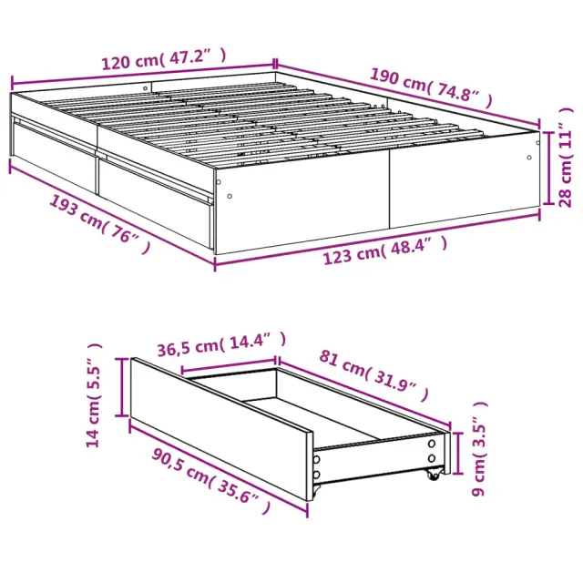 Dodajte svoji spalnici moderen pridih s tem posteljnim okvirjem s predali! Predstavlja praktičen in dekorativen dodatek za vaš bivalni prostor. Vzdržljiv material: Posteljni okvir je izdelan iz inženirskega lesa. Inženirski les se ponaša z izjemno kakovostjo, gladko površino ter močjo, stabilnostjo in odpornostjo na vlago.Trdne letvice: Letvice iz vezanega lesa omogočajo dobro porazdelitev teže in zagotavljajo, da vzmetnica ostane na mestu ob vsakem zasuku in obračanju med spanjem.Funkcija shranjevanja: Priloženi posteljni predali nudijo dovolj prostora za shranjevanje potrebščin, da bo soba čista in urejena. Dobro je vedeti:Vzmetnica ni priložena tej postelji. Ponujamo različno izbiro ležišč. V naši trgovini si lahko ogledate ustrezne vzmetnice.Barva: Dimljeni hrastMaterial posteljnega okvirja: Inženirski lesMaterial letvic: Vezan lesCelotne dimenzije: 193 x 123 x 28 cm (D x Š x V)Velikost primerne vzmetnice: 120 x 190 cm (Š x D) (vzmetnica ni priložena)Dimenzije posteljnega predala (vsak): 90,5 x 36,5 x 14 cm (D x Š x V)Potrebno sestavljanje: DaPaket vsebuje:1 x Posteljni okvir4 x Posteljni predal 3280703