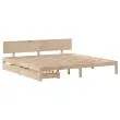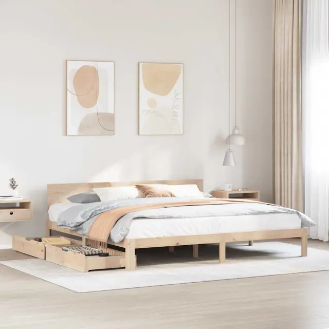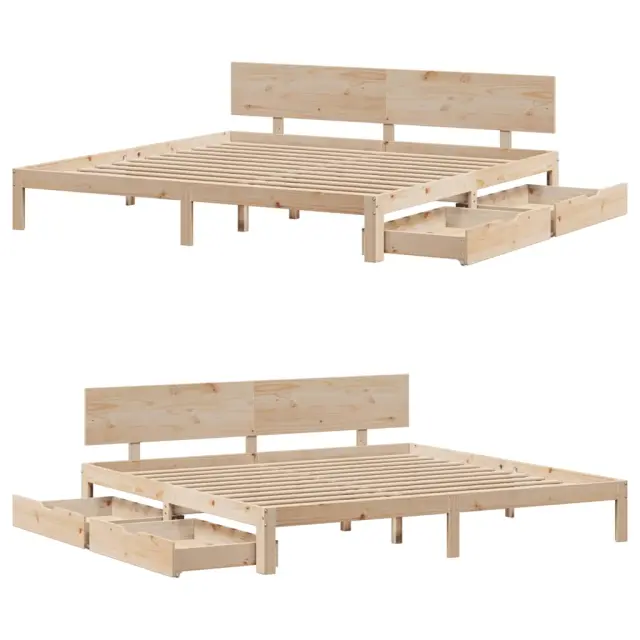 Zagotovite si boljši spanec s tem posteljnim okvirjem! Je prijeten dodatek za vsako spalnico. Stabilen in dolgotrajen okvir: Trdna borovina je znana po svoji trdnosti in trajnosti. Ravni vzorci in značilni vozli prispevajo k njenemu rustikalnemu čaru.Podnožje z letvami za optimalno podporo: Za podporo in zračnost ležišča je posteljni okvir opremljen z letvenim dnom.Dodaten prostor za shranjevanje: Ta posteljni okvir ima spodaj dva predala, ki omogočata shranjevanje predmetov, kot so dodatna posteljnina, sezonska oblačila in igrače.Vsestransko vzglavje: Ta postelja je opremljena z vzglavjem, ki zagotavlja odlično oporo hrbtu, ko sedite v postelji in berete ali gledate televizijo, hkrati pa služi tudi kot dekorativni element.Preprosto manevriranje: Ta predal za shranjevanje pod posteljo ima štiri kolesa, ki zagotavljajo gladko in lahkotno manevriranje pri drsenju pod posteljo in izpod nje. Dobro je vedeti:Vzmetnica ni priložena tej postelji. Ponujamo različno izbiro ležišč. V naši trgovini si lahko ogledate ustrezne vzmetnice.Material: Trdna borovina (neobdelana)Potrebno sestavljanje: DaPostelja:Material letvic: Vezan lesCelotne dimenzije: 205,5 x 183,5 x 69,5 cm (D x Š x V)Spalna višina, merjena od tal: 23 cmVelikost primerne vzmetnice: 180 x 200 cm (Š x D) (vzmetnica ni priložena)Predal:Zunanje dimenzije: 90 x 55 x 17 cm (Š x G x V)Notranje dimenzije: 81,5 x 52,5 x 10 cm (Š x G x V)Maks. nosilnost (vsaka): 20 kgS štirimi kolesiPaket vsebuje:1 x Posteljni okvir1 x Vzglavje2 x Predal 3301990