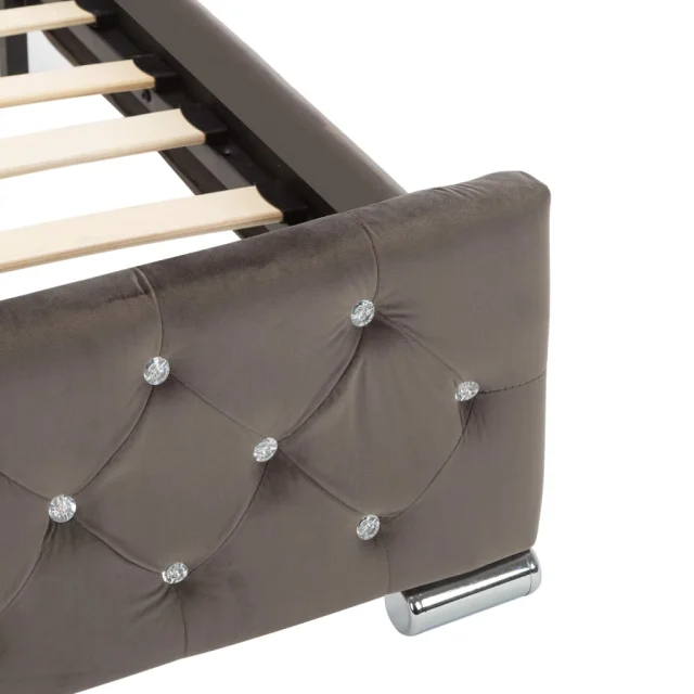 Ta posteljni okvir s preprostim in elegantnim dizajnom bo dekorju v vaši spalnici dodal pridih elegance. Ta posteljni okvir iz lesa in jekla je zelo močan in vzdržljiv. Kovinske noge postelji dodajajo vzdržljivost. Postelja je oblazinjena v trpežen žamet, izžareva privlačen videz in je enostavna za čiščenje. Ta posteljni okvir je primeren za vzmetnico velikosti 180 x 200 cm.