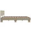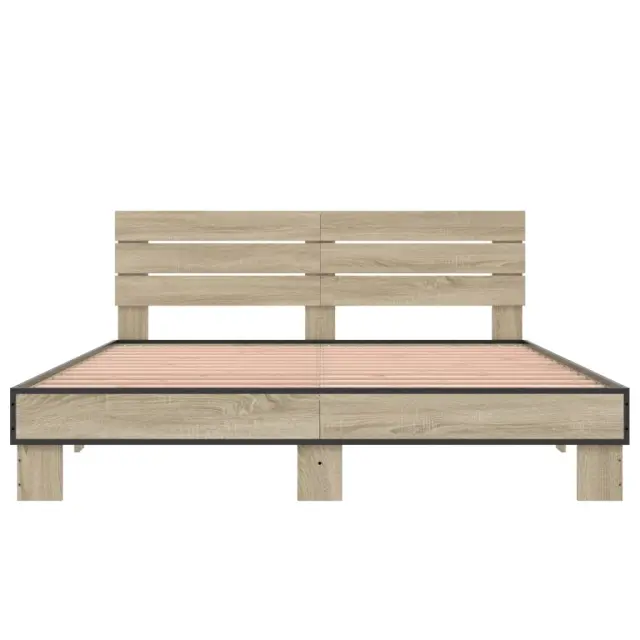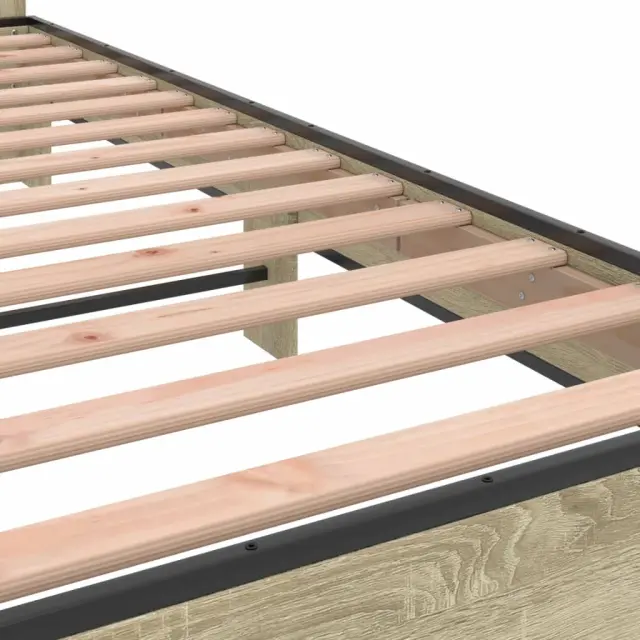 Zagotovite si boljši spanec s tem posteljnim okvirjem! Je prijeten dodatek za vsako spalnico. Vzdržljiv material: Inženirski les se ponaša z izjemno kakovostjo, gladko površino ter močjo, stabilnostjo in odpornostjo na vlago. Letvice iz vezanega lesa: Letvice iz vezanega lesa omogočajo dobro porazdelitev teže in zagotavljajo, da vzmetnica ostane na mestu ob vsakem zasuku in obračanju med spanjem.Odlična podpora: Vzglavje zagotavlja odlično oporo hrbtu, ko sedite v postelji in berete ali gledate televizijo. Dobro je vedeti: Vzmetnica ni priložena tej postelji. Ponujamo različno izbiro ležišč. V naši trgovini si lahko ogledate ustrezne vzmetnice.Barva: Sonoma hrastMaterial posteljnega okvirja: Inženirski les, kovinaMaterial letvic: Vezan lesCelotne dimenzije: 203 x 153 x 81 cm (D x Š x V)Velikost primerne vzmetnice: 150 x 200 cm (Š x D) (vzmetnica ni priložena)Potrebno sestavljanje: Da 3280143
