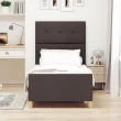 Ta posteljni okvir združuje tradicionalni šarm in trdno zgradbo. Temno rjava tkanina in gladka površina ustvarjata toplo in prijetno vzdušje, ki se lepo ujema s katerimkoli stilom spalnice, nudijoč eleganco in udobje.