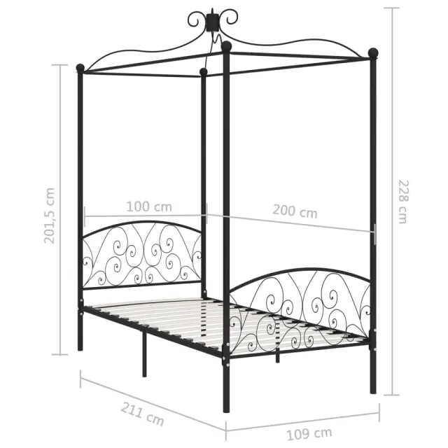 Z našim kovinskim posteljnim okvirjem z ogrodjem za baldahin lahko v svoji spalnici ustvarite elegantno in klasično vzdušje! Postelja je pametno zasnovana z ogrodjem za baldahin za obešanje najljubših zaves ali mreže za komarje, kar bo prispevalo k edinstvenemu šarmu vaše spalnice in ustvarilo dodatno zasebnost. Ta posteljni okvir je izdelan iz trdne kovine, zato je izjemno močan in trpežen. Z vsemi temi lastnostmi boste ponoči dobro spali! Posteljni okvir je potrebno sestaviti. Upoštevajte, da paket vsebuje samo posteljni okvir s podom iz letvic. Vzmetnica ni priložena. V naši trgovini si lahko ogledate primerno vzmetnico.Barva: ČrnaMaterial: Kovina + vezan lesCelotne dimenzije: 211 x 109 x 227 cm (D x Š x V)Spalna višina, merjena od tal: 28 cmVelikost primerne vzmetnice: 100 x 200 cm (Š x D) (vzmetnica ni priložena)Z izjemnim dizajnomPrimerno za obešanje baldahina za posteljo ali mreže za komarje 284475