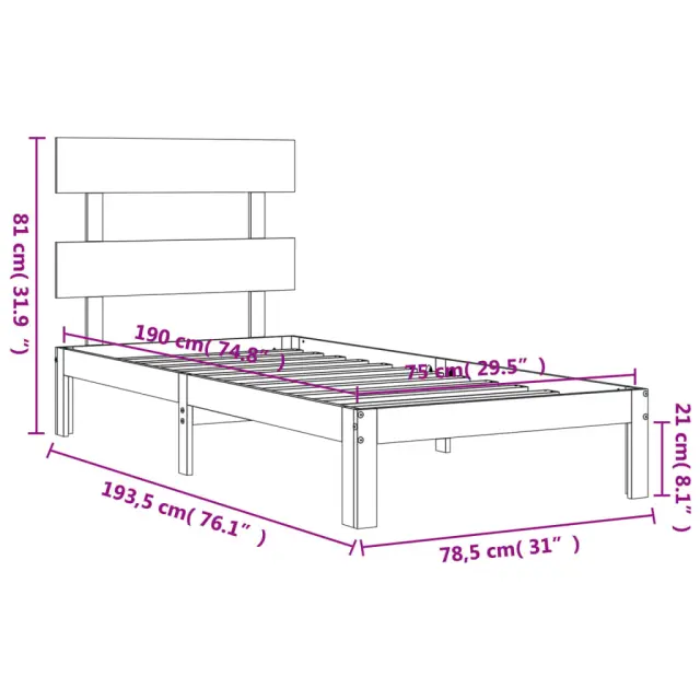 S tem lesenim posteljnim okvirjem lahko uživate v odličnem spancu! To je praktičen in dekorativen dodatek za vaše notranje prostore. Vzdržljiv material: Trdna borovina je čudovit naravni material. Borovina ima ravne vzorce, grče pa dajejo materialu njegov značilen, rustikalen videz. Ta postelja je izdelana iz trdnega borovega lesa, zato je trpežna in vzdržljiva.Letvice iz vezanega lesa: Letvice iz vezanega lesa zagotavljajo dobro porazdelitev teže, kar ležišču zagotavlja prepotrebno oporo in zračnost.Odlična opora: Vzglavje lesene postelje zagotavlja odlično oporo hrbtu, ko sedite v postelji in berete ali gledate televizijo. Dobro je vedeti: Vzmetnica ni priložena tej postelji. Ponujamo različno izbiro ležišč. V naši trgovini si lahko ogledate ustrezne vzmetnice.Material: Trdna borovina (neobdelana)Celotne dimenzije postelje: 193,5 x 78,5 x 81 cm (D x Š x V)Višina prostora pod posteljo: 21 cmPrimerna velikost vzmetnice (vzmetnica ni vključena): 75 x 190 cm (Š x D) (2FT6 Small Single)Potrebno sestavljanje: Da 3193491