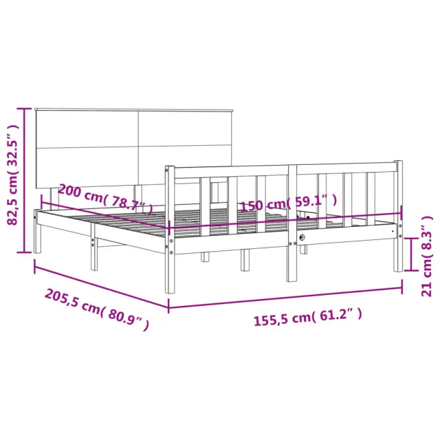 S tem lesenim posteljnim okvirjem lahko uživate v odličnem spancu! To je praktičen in dekorativen dodatek za vaše notranje prostore. Vzdržljiv material: Trdna borovina je čudovit naravni material. Borovina ima ravne vzorce, grče pa dajejo materialu njegov značilen, rustikalen videz. Ta postelja je izdelana iz trdnega borovega lesa, zato je trpežna in vzdržljiva.Letvice iz vezanega lesa: Letvice iz vezanega lesa zagotavljajo dobro porazdelitev teže, kar ležišču zagotavlja prepotrebno oporo in zračnost.Funkcionalno vzglavje in podnožje: Vzglavje in podnožje lesene postelje ohranjata ležišče na mestu. Poleg tega vzglavje zagotavlja odlično oporo hrbtu, ko sedite v postelji in berete ali gledate televizijo. Dobro je vedeti: Vzmetnica ni priložena tej postelji. Ponujamo različno izbiro ležišč. V naši trgovini si lahko ogledate ustrezne vzmetnice.Material: Trdna borovina (neobdelana)Celotne dimenzije postelje: 205,5 x 155,5 x 82,5 cm (D x Š x V)Višina prostora pod posteljo: 21 cmPrimerna velikost vzmetnice (vzmetnica ni vključena): 150 x 200 cm (Š x D) (5FT King Size)Potrebno sestavljanje: Da 3193406