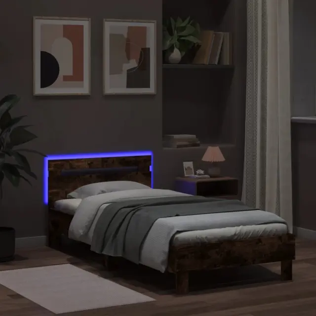 vidaXL Posteljni okvir z vzglavjem in LED dimljeni hrast 100x200 cm
