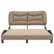 Zagotovite si boljši spanec s tem posteljnim okvirjem z vzglavjem! Je prijeten dodatek za vsako spalnico. Trpežno umetno usnje: Vrhunsko umetno usnje je zelo vzdržljiv material. Je odporno na madeže, zato ga lahko preprosto čistite z vlažno krpo. Gladka površina mu prav tako daje razkošen videz in lepoto pravega usnja.Letvice iz vezanega lesa: Letvice iz vezanega lesa omogočajo dobro porazdelitev teže in zagotavljajo, da vzmetnica ostane na mestu ob vsakem zasuku in obračanju med spanjem.Odlična podpora: Vzglavna stranica je napolnjena s PP vlakni za izjemno mehkobo in optimalno udobje ter zagotavlja odlično podporo hrbtu, ko sedite v postelji in berete ali gledate televizijo.Valovita stranica: Valoviti videz posteljnega okvirja je eleganten in prefinjen. Dekorju v vašem domu dodaja sodoben in eleganten pridih ter tako postane osrednja točka spalnice. Dobro je vedeti:Vzmetnica ni priložena tej postelji. Ponujamo različno izbiro ležišč. V naši trgovini si lahko ogledate ustrezne vzmetnice.Posteljni okvir z vzglavjem:Barva: KapučinoMaterial: Umetno usnje (75 % polivinilklorid, 5 % bombaž, 20 % poliester), kovina, trdna borovina, vezan lesCelotne dimenzije: 218 x 125 x 74,5 cm (D x Š x V)Velikost primerne vzmetnice: 120 x 200 cm (Š x D) (vzmetnica ni priložena)Oblazinjeno vzglavje:Barva: KapučinoMaterial: Umetno usnje (75 % polivinilklorid, 5 % bombaž, 20 % poliester)Material polnila: PP vlaknaDimenzije: 130 x 15 x 48 cm (D x Š x V)Primerna širina vzmetnice: 120 cmPotrebno sestavljanje: DaPaket vsebuje:1 x Posteljni okvir z vzglavjem1 x Oblazinjeno vzglavje 3207992