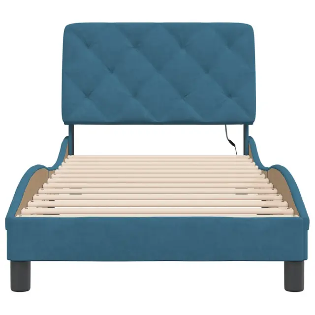 Zagotovite si boljši spanec s tem posteljnim okvirjem z LED lučkami! Je prijeten dodatek za vsako spalnico. Mehak žamet: Žamet je mehka in udobna tkanina, ki je prijetna do kože. Letvice iz vezanega lesa: Letvice iz vezanega lesa omogočajo dobro porazdelitev teže in zagotavljajo, da vzmetnica ostane na mestu ob vsakem zasuku in obračanju med spanjem. Odlična podpora: Vzglavna stranica je napolnjena s peno za izjemno mehkobo in optimalno udobje ter zagotavlja odlično podporo hrbtu, ko sedite v postelji in berete ali gledate televizijo. Barvit LED trak: Vnesite igrivost v temo z barvitimi LED lučkami! Kljuke in zanke na hrbtni strani vzglavja lahko uporabite za pritrditev LED lučk. Valovita stranica: Valoviti videz posteljnega okvirja je eleganten in prefinjen. Dekorju v vašem domu dodaja sodoben in eleganten pridih ter tako postane osrednja točka spalnice. Dobro je vedeti:Vzmetnica ni priložena tej postelji. Ponujamo različno izbiro ležišč. V naši trgovini si lahko ogledate ustrezne vzmetnice.Izdelek ima priključek USB, ki zahteva certificiran vir napajanja 5 V USB (ni priložen).Posteljni okvir:Barva: ModraMaterial: Žamet (100 % poliester), kovina, trdna borovina, vezan les, inženirski lesCelotne dimenzije: 208 x 95 x 74,5 cm (D x Š x V)Velikost primerne vzmetnice: 90 x 190 cm (Š x D) (vzmetnica ni priložena)Oblazinjeno vzglavje:Barva: ModraMaterial: Žamet (100 % poliester)Material polnila: PenaDimenzije: 92 x 6 x 48 cm (D x Š x V)LED trak:Dolžina: 55 cmNapetost: DC 5 VDolžina kabla USB: 140 cmDolžina električnega kabla: 30 cmIP ocena: IP65Paket vsebuje:1 x Posteljni okvir1 x Oblazinjeno vzglavje1 x LED trak 3213829