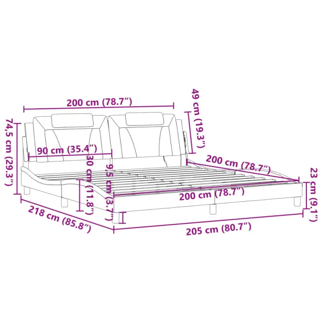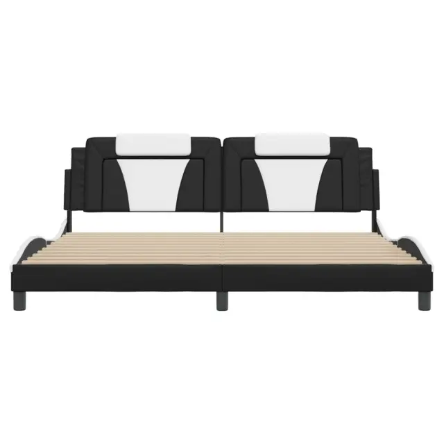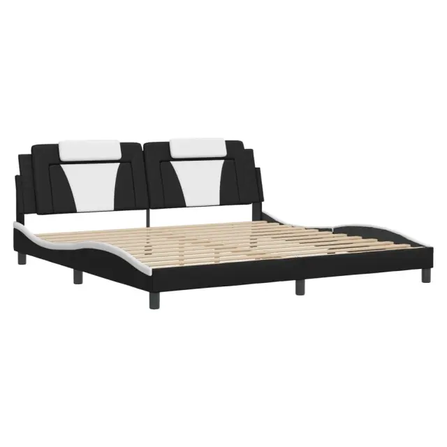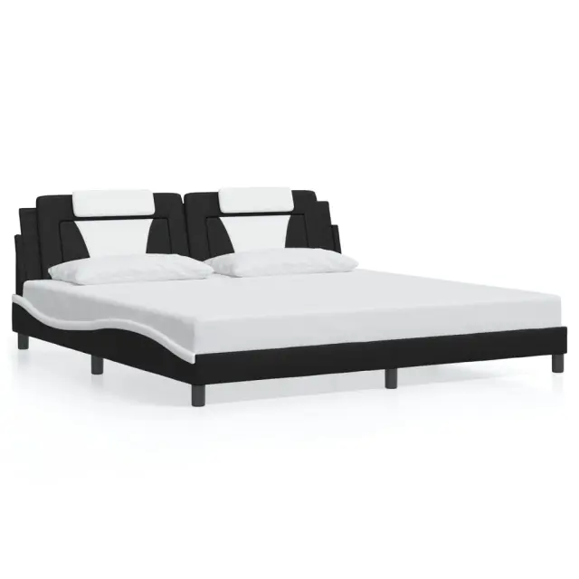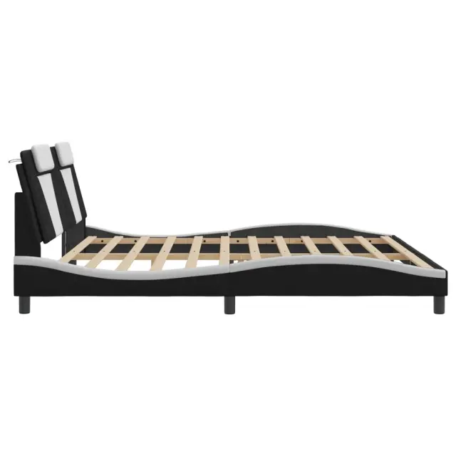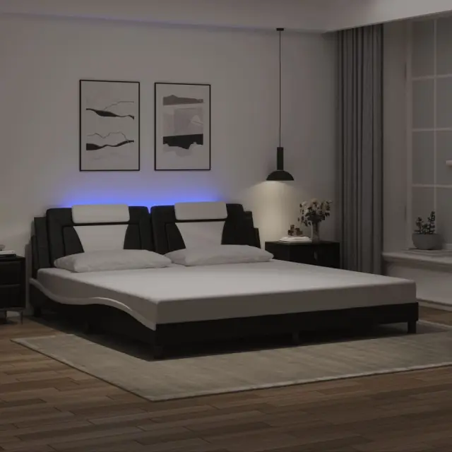 Zagotovite si boljši spanec s tem posteljnim okvirjem z LED lučkami! Je prijeten dodatek za vsako spalnico. Trpežno umetno usnje: Vrhunsko umetno usnje je zelo vzdržljiv material. Je odporno na madeže, zato ga lahko preprosto čistite z vlažno krpo. Gladka površina mu prav tako daje razkošen videz in lepoto pravega usnja.Letvice iz vezanega lesa: Letvice iz vezanega lesa omogočajo dobro porazdelitev teže in zagotavljajo, da vzmetnica ostane na mestu ob vsakem zasuku in obračanju med spanjem. Odlična podpora: Vzglavna stranica je napolnjena s peno za izjemno mehkobo in optimalno udobje ter zagotavlja odlično podporo hrbtu, ko sedite v postelji in berete ali gledate televizijo. Barvit LED trak: Vnesite igrivost v temo z barvitimi LED lučkami! Kljuke in zanke na hrbtni strani vzglavja lahko uporabite za pritrditev LED lučk. Valovita stranica: Valoviti videz posteljnega okvirja je eleganten in prefinjen. Dekorju v vašem domu dodaja sodoben in eleganten pridih ter tako postane osrednja točka spalnice. Dobro je vedeti:Vzmetnica ni priložena tej postelji. Ponujamo različno izbiro ležišč. V naši trgovini si lahko ogledate ustrezne vzmetnice.Izdelek ima priključek USB, ki zahteva certificiran vir napajanja 5 V USB (ni priložen).Posteljni okvir z vzglavjem:Barva: Črna in belaMaterial: Umetno usnje (75 % polivinilklorid, 5 % bombaž, 20 % poliester), kovina, trdna borovina, vezan lesCelotne dimenzije: 218 x 205 x 74,5 cm (D x Š x V)Velikost primerne vzmetnice: 200 x 200 cm (Š x D) (vzmetnica ni priložena)Oblazinjeno vzglavje:Barva: ČrnaMaterial: Umetno usnje (75 % polivinilklorid, 5 % bombaž, 20 % poliester)Material polnila: PenaDimenzije: 200 x 15 x 49 cm (D x Š x V)Primerna širina vzmetnice: 200 cmLED trak:Dolžina (vsak): 56 cmNapetost: DC 5 VDolžina kabla USB : 150 cmDolžina električnega kabla: 30 cmIP ocena: IP65S simbolom za rezanje s škarjamiPotrebno sestavljanje: DaPaket vsebuje:1 x Posteljni okvir z vzglavjem1 x Oblazinjeno vzglavje2 x LED trak 3214048