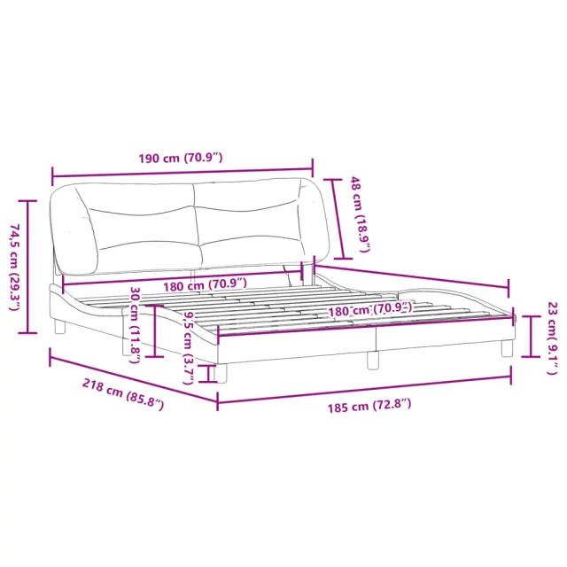 Zagotovite si boljši spanec s tem posteljnim okvirjem z LED lučkami! Je prijeten dodatek za vsako spalnico. Trpežno blago: Blago zagotavlja preprost in čist videz, poleg tega pa je zračno in trpežno.Letvice iz vezanega lesa: Letvice iz vezanega lesa omogočajo dobro porazdelitev teže in zagotavljajo, da vzmetnica ostane na mestu ob vsakem zasuku in obračanju med spanjem.Udobna opora: To vzglavje za posteljo vam zagotavlja odlično oporo za hrbet, ko sedite na postelji in berete ali gledate filme.Barvit LED trak: Vnesite igrivost v temo z barvitimi LED lučkami! Kljuke in zanke na hrbtni strani vzglavja lahko uporabite za pritrditev LED lučk.Valovita stranica: Valoviti videz posteljnega okvirja je eleganten in prefinjen. Dekorju v vašem domu dodaja sodoben in eleganten pridih ter tako postane osrednja točka spalnice. Dobro je vedeti:Vzmetnica ni priložena tej postelji. Ponujamo različno izbiro ležišč. V naši trgovini si lahko ogledate ustrezne vzmetnice.Izdelek ima priključek USB, ki zahteva certificiran vir napajanja 5 V USB (ni priložen).Posteljni okvir:Barva: KremMaterial: Tkanina (100 % poliester), kovina, trdna borovina, vezan lesCelotne dimenzije: 218 x 185 x 74,5 cm (D x Š x V)Velikost primerne vzmetnice: 180 x 200 cm (Š x D) (vzmetnica ni priložena)Potrebno sestavljanje: DaOblazinjeno vzglavje:Barva: KremMaterial: Blago (100 % poliester)Material polnila: PP vlaknaDimenzije: 190 x 15 x 48 cm (D x Š x V)Širina primerne vzmetnice: 180 cmLED trak:Dolžina: 55 cmNapetost: DC 5 VDolžina kabla USB: 140 cmDolžina električnega kabla: 30 cmIP ocena: IP65Paket vsebuje:1 x Posteljni okvir1 x Oblazinjeno vzglavje2 x LED trak 3213723