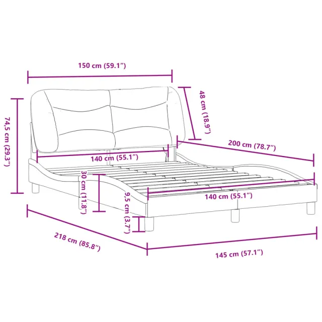 Zagotovite si boljši spanec s tem posteljnim okvirjem z LED lučkami! Je prijeten dodatek za vsako spalnico. Trpežno blago: Blago zagotavlja preprost in čist videz, poleg tega pa je zračno in trpežno.Letvice iz vezanega lesa: Letvice iz vezanega lesa omogočajo dobro porazdelitev teže in zagotavljajo, da vzmetnica ostane na mestu ob vsakem zasuku in obračanju med spanjem.Udobna opora: To vzglavje za posteljo vam zagotavlja odlično oporo za hrbet, ko sedite na postelji in berete ali gledate filme.Barvit LED trak: Vnesite igrivost v temo z barvitimi LED lučkami! Kljuke in zanke na hrbtni strani vzglavja lahko uporabite za pritrditev LED lučk.Valovita stranica: Valoviti videz posteljnega okvirja je eleganten in prefinjen. Dekorju v vašem domu dodaja sodoben in eleganten pridih ter tako postane osrednja točka spalnice. Dobro je vedeti:Vzmetnica ni priložena tej postelji. Ponujamo različno izbiro ležišč. V naši trgovini si lahko ogledate ustrezne vzmetnice.Izdelek ima priključek USB, ki zahteva certificiran vir napajanja 5 V USB (ni priložen).Posteljni okvir:Barva: Temno rjavaMaterial: Tkanina (100 % poliester), kovina, trdna borovina, vezan lesCelotne dimenzije: 218 x 145 x 74,5 cm (D x Š x V)Velikost primerne vzmetnice: 140 x 200 cm (Š x D) (vzmetnica ni priložena)Potrebno sestavljanje: DaOblazinjeno vzglavje:Barva: Temno rjavaMaterial: Blago (100 % poliester)Material polnila: PP vlaknaDimenzije: 150 x 15 x 48 cm (D x Š x V)Primerna širina vzmetnice: 140 cmLED trak:Dolžina: 55 cmNapetost: DC 5 VDolžina kabla USB: 140 cmDolžina električnega kabla: 30 cmIP ocena: IP65Paket vsebuje:1 x Posteljni okvir1 x Oblazinjeno vzglavje2 x LED trak 3213707