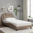 Zagotovite si boljši spanec s tem posteljnim okvirjem z vzglavjem! Je prijeten dodatek za vsako spalnico. Trpežno umetno usnje: Vrhunsko umetno usnje je zelo vzdržljiv material. Je odporno na madeže, zato ga lahko preprosto čistite z vlažno krpo. Gladka površina mu prav tako daje razkošen videz in lepoto pravega usnja.Letvice iz vezanega lesa: Letvice iz vezanega lesa omogočajo dobro porazdelitev teže in zagotavljajo, da vzmetnica ostane na mestu ob vsakem zasuku in obračanju med spanjem.Odlična podpora: Vzglavna stranica je napolnjena s peno za izjemno mehkobo in optimalno udobje ter zagotavlja odlično podporo hrbtu, ko sedite v postelji in berete ali gledate televizijo.Valovita stranica: Valoviti videz posteljnega okvirja je eleganten in prefinjen. Dekorju v vašem domu dodaja sodoben in eleganten pridih ter tako postane osrednja točka spalnice. Dobro je vedeti:Vzmetnica ni priložena tej postelji. Ponujamo različno izbiro ležišč. V naši trgovini si lahko ogledate ustrezne vzmetnice.Posteljni okvir z vzglavjem:Barva: KapučinoMaterial: Umetno usnje (75 % polivinilklorid, 5 % bombaž, 20 % poliester), kovina, trdna borovina, vezan lesCelotne dimenzije: 218 x 105 x 74,5 cm (D x Š x V)Velikost primerne vzmetnice: 100 x 200 cm (Š x D) (vzmetnica ni priložena)Oblazinjeno vzglavje:Barva: KapučinoMaterial: Umetno usnje (75 % polivinilklorid, 5 % bombaž, 20 % poliester)Material polnila: PenaDimenzije: 100 x 15 x 49 cm (D x Š x V)Širina primerne vzmetnice: 100 cmPotrebno sestavljanje: DaPaket vsebuje:1 x Posteljni okvir z vzglavjem1 x Oblazinjeno vzglavje 3208079