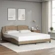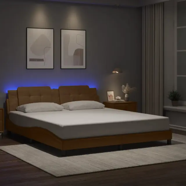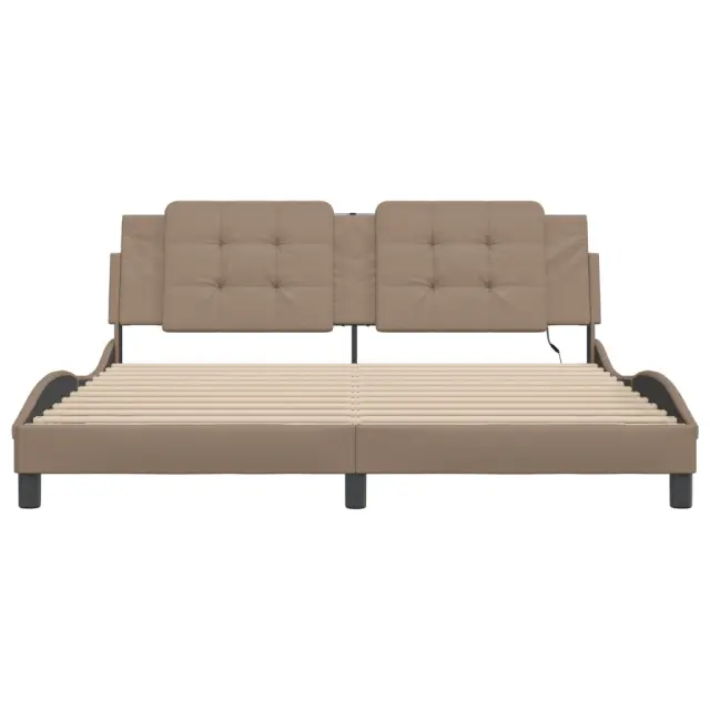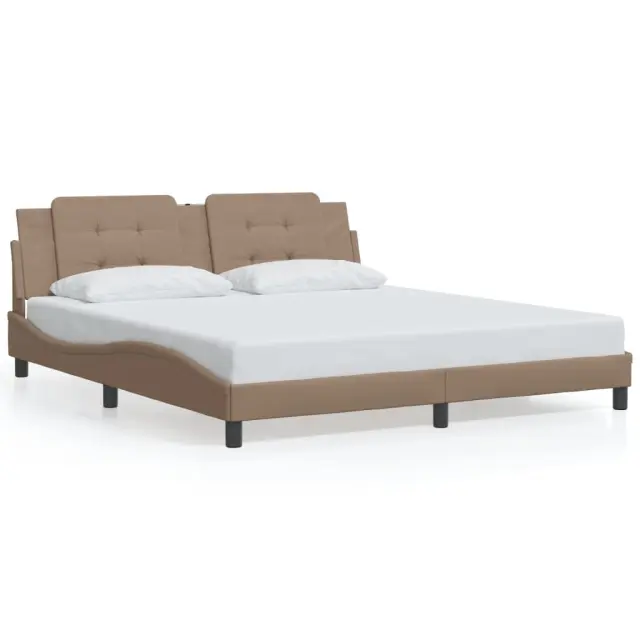 Zagotovite si boljši spanec s tem posteljnim okvirjem z LED lučkami! Je prijeten dodatek za vsako spalnico. Trpežno umetno usnje: Vrhunsko umetno usnje je zelo vzdržljiv material. Je odporno na madeže, zato ga lahko preprosto čistite z vlažno krpo. Gladka površina mu prav tako daje razkošen videz in lepoto pravega usnja.Letvice iz vezanega lesa: Letvice iz vezanega lesa omogočajo dobro porazdelitev teže in zagotavljajo, da vzmetnica ostane na mestu ob vsakem zasuku in obračanju med spanjem.Udobna opora: To vzglavje za posteljo vam zagotavlja odlično oporo za hrbet, ko sedite na postelji in berete ali gledate filme.Barvit LED trak: Vnesite igrivost v temo z barvitimi LED lučkami! Kljuke in zanke na hrbtni strani vzglavja lahko uporabite za pritrditev LED lučk.Valovita stranica: Valoviti videz posteljnega okvirja je eleganten in prefinjen. Dekorju v vašem domu dodaja sodoben in eleganten pridih ter tako postane osrednja točka spalnice. Dobro je vedeti:Vzmetnica ni priložena tej postelji. Ponujamo različno izbiro ležišč. V naši trgovini si lahko ogledate ustrezne vzmetnice.Izdelek ima priključek USB, ki zahteva certificiran vir napajanja 5 V USB (ni priložen).Posteljni okvir:Barva: KapučinoMaterial: Umetno usnje (75 % polivinilklorid, 5 % bombaž, 20 % poliester), kovina, trdna borovina, vezan lesCelotne dimenzije: 218 x 185 x 74,5 cm (D x Š x V)Velikost primerne vzmetnice: 180 x 200 cm (Š x D) (vzmetnica ni priložena)Potrebno sestavljanje: DaOblazinjeno vzglavje:Barva: KapučinoMaterial: Umetno usnje (75 % polivinilklorid, 5 % bombaž, 20 % poliester)Material polnila: PenaDimenzije: 180 x 3 x 48 cm (D x Š x V)Širina primerne vzmetnice: 180 cmLED trak:Dolžina: 55 cmNapetost: DC 5 VDolžina kabla USB: 140 cmDolžina električnega kabla: 30 cmIP ocena: IP65Paket vsebuje:1 x Posteljni okvir1 x Oblazinjeno vzglavje2 x LED trak 3214128