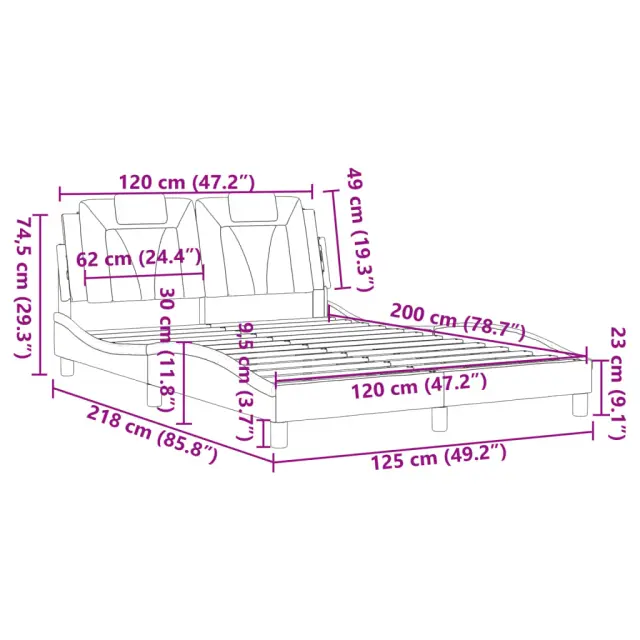 Zagotovite si boljši spanec s tem posteljnim okvirjem z vzglavjem! Je prijeten dodatek za vsako spalnico. Trpežno umetno usnje: Vrhunsko umetno usnje je zelo vzdržljiv material. Je odporno na madeže, zato ga lahko preprosto čistite z vlažno krpo. Gladka površina mu prav tako daje razkošen videz in lepoto pravega usnja.Letvice iz vezanega lesa: Letvice iz vezanega lesa omogočajo dobro porazdelitev teže in zagotavljajo, da vzmetnica ostane na mestu ob vsakem zasuku in obračanju med spanjem.Odlična podpora: Vzglavna stranica je napolnjena s peno za izjemno mehkobo in optimalno udobje ter zagotavlja odlično podporo hrbtu, ko sedite v postelji in berete ali gledate televizijo.Valovita stranica: Valoviti videz posteljnega okvirja je eleganten in prefinjen. Dekorju v vašem domu dodaja sodoben in eleganten pridih ter tako postane osrednja točka spalnice. Dobro je vedeti:Vzmetnica ni priložena tej postelji. Ponujamo različno izbiro ležišč. V naši trgovini si lahko ogledate ustrezne vzmetnice.Posteljni okvir z vzglavjem:Barva: Črna in belaMaterial: Umetno usnje (75 % polivinilklorid, 5 % bombaž, 20 % poliester), kovina, trdna borovina, vezan lesCelotne dimenzije: 218 x 125 x 74,5 cm (D x Š x V)Velikost primerne vzmetnice: 120 x 200 cm (Š x D) (vzmetnica ni priložena)Oblazinjeno vzglavje:Barva: ČrnaMaterial: Umetno usnje (75 % polivinilklorid, 5 % bombaž, 20 % poliester)Material polnila: PenaDimenzije: 120 x 15 x 49 cm (D x Š x V)Primerna širina vzmetnice: 120 cmPotrebno sestavljanje: DaPaket vsebuje:1 x Posteljni okvir z vzglavjem1 x Oblazinjeno vzglavje 3208087