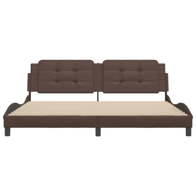 Zagotovite si boljši spanec s tem posteljnim okvirjem z vzglavjem! Je prijeten dodatek za vsako spalnico. Trpežno umetno usnje: Vrhunsko umetno usnje je zelo vzdržljiv material. Je odporno na madeže, zato ga lahko preprosto čistite z vlažno krpo. Gladka površina mu prav tako daje razkošen videz in lepoto pravega usnja.Letvice iz vezanega lesa: Letvice iz vezanega lesa omogočajo dobro porazdelitev teže in zagotavljajo, da vzmetnica ostane na mestu ob vsakem zasuku in obračanju med spanjem.Odlična podpora: Vzglavna stranica je napolnjena s peno za izjemno mehkobo in optimalno udobje ter zagotavlja odlično podporo hrbtu, ko sedite v postelji in berete ali gledate televizijo.Priročna zasnova: Oblazinjeno vzglavje ima zadrgo za enostavno namestitev.Valovita stranica: Valoviti videz posteljnega okvirja je eleganten in prefinjen. Dekorju v vašem domu dodaja sodoben in eleganten pridih ter tako postane osrednja točka spalnice. Dobro je vedeti:Vzmetnica ni priložena tej postelji. Ponujamo različno izbiro ležišč. V naši trgovini si lahko ogledate ustrezne vzmetnice.Posteljni okvir z vzglavjem:Barva: RjavaMaterial: Umetno usnje (75 % polivinilklorid, 5 % bombaž, 20 % poliester), kovina, trdna borovina, vezan lesCelotne dimenzije: 218 x 205 x 74,5 cm (D x Š x V)Velikost primerne vzmetnice: 200 x 200 cm (Š x D) (vzmetnica ni priložena)Oblazinjeno vzglavje:Barva: RjavaMaterial: Umetno usnje (75 % polivinilklorid, 5 % bombaž, 20 % poliester)Material polnila: PenaDimenzije: 200 x 3 x 48 cm (D x Š x V)Primerna širina vzmetnice: 200 cmPotrebno sestavljanje: DaPaket vsebuje:1 x Posteljni okvir z vzglavjem1 x Oblazinjeno vzglavje 3208207
