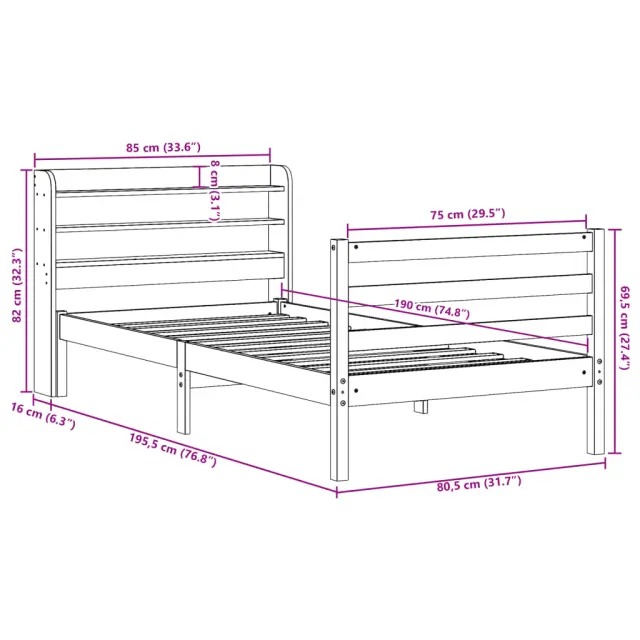 S tem lesenim posteljnim okvirjem lahko uživate v odličnem spancu! To je praktičen in dekorativen dodatek za vaše notranje prostore. Trdna borovina: Trdna borovina je čudovit naravni material. Borovina ima ravne vzorce, grče pa dajejo materialu njegov značilen, rustikalen videz.Praktične letvice: Letvice zagotavljajo dobro porazdelitev teže, kar ležišču zagotavlja prepotrebno oporo in zračnost.Veliko prostora za shranjevanje: To elegantno posteljno vzglavje ima dve priročni polici, ki ponujata veliko prostora za shranjevanje, da bodo vaše večerne potrebščine na dosegu roke.Samostoječe vzglavje: Samostoječe vzglavje ponuja brezskrbno rešitev za enostavno postavitev in premikanje brez potrebe po vgradnji na steno. Dobro je vedeti: Vzmetnica ni priložena tej postelji. Ponujamo različno izbiro ležišč. V naši trgovini si lahko ogledate ustrezne vzmetnice.Material: Trdna borovina (neobdelana)Celotne dimenzije: 211,5 x 85 x 82 cm (D x Š x V)Višina prostora pod posteljo: 21 cmVelikost primerne vzmetnice: 75 x 190 cm (Š x D) (vzmetnica ni priložena)S policami za shranjevanjePotrebno sestavljanje: Da 3306629