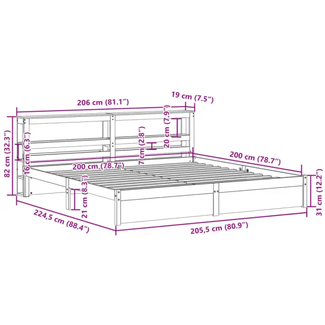 S tem lesenim posteljnim okvirjem lahko uživate v odličnem spancu! To je praktičen in dekorativen dodatek za vaše notranje prostore. Trdna borovina: Trdna borovina je čudovit naravni material. Borovina ima ravne vzorce, grče pa dajejo materialu njegov značilen, rustikalen videz.Močan posteljni okvir: Lesen okvir zagotavlja trdnost in stabilnost. Letvice iz vezanega lesa omogočajo dobro porazdelitev teže in zagotavljajo, da vzmetnica ostane na mestu ob vsakem zasuku in obračanju med spanjem.Vsestransko vzglavje: Ta posteljni okvir je opremljen z vzglavjem, ki zagotavlja odlično oporo hrbtu, ko sedite v postelji in berete ali gledate televizijo, hkrati pa služi tudi kot dekorativni element.Veliko prostora za shranjevanje: To elegantno vzglavje ima dve priročni polici, ki ponujata veliko prostora za shranjevanje, da bodo vaše večerne potrebščine na dosegu roke. Dobro je vedeti:Vzmetnica ni priložena tej postelji. Ponujamo različno izbiro ležišč. V naši trgovini si lahko ogledate ustrezne vzmetnice.Barva: BelaMaterial posteljnega okvirja: Trdna borovinaMaterial letvic: Vezan lesCelotne dimenzije: 224,5 x 206 x 82 cm (D x Š x V)Velikost primerne vzmetnice: 200 x 200 cm (Š x D) (vzmetnica ni priložena)Dimenzije vzglavja: 206 x 19 x 82 cm (D x Š x V)S policami za shranjevanjePotrebno sestavljanje: DaPaket vsebuje:1 x Posteljni okvir1 x Vzglavje 3306004