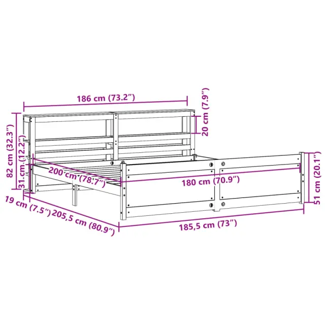 S tem lesenim posteljnim okvirjem lahko uživate v odličnem spancu! To je praktičen in dekorativen dodatek za vaše notranje prostore. Trdna borovina: Trdna borovina je čudovit naravni material. Borovina ima ravne vzorce, grče pa dajejo materialu njegov značilen, rustikalen videz.Močan posteljni okvir: Lesen okvir zagotavlja trdnost in stabilnost. Letvice iz vezanega lesa omogočajo dobro porazdelitev teže in zagotavljajo, da vzmetnica ostane na mestu ob vsakem zasuku in obračanju med spanjem.Funkcionalno vzglavje in podnožje: Vzglavje in podnožje lesene postelje ohranjata ležišče na mestu. Poleg tega vzglavje zagotavlja odlično oporo hrbtu, ko sedite v postelji in berete ali gledate televizijo.Veliko prostora za shranjevanje: To elegantno vzglavje ima dve priročni polici, ki ponujata veliko prostora za shranjevanje, da bodo vaše večerne potrebščine na dosegu roke. Dobro je vedeti:Vzmetnica ni priložena tej postelji. Ponujamo različno izbiro ležišč. V naši trgovini si lahko ogledate ustrezne vzmetnice.Material posteljnega okvirja: Trdna borovina (neobdelana)Material letvic: Vezan lesCelotne dimenzije: 224,5 x 186 x 82 cm (D x Š x V)Velikost primerne vzmetnice: 180 x 200 cm (Š x D) (vzmetnica ni priložena)Dimenzije vzglavja: 186 x 19 x 82 cm (D x Š x V)S policami za shranjevanjePotrebno sestavljanje: DaPaket vsebuje:1 x Posteljni okvir z vznožjem1 x Vzglavje 3306027