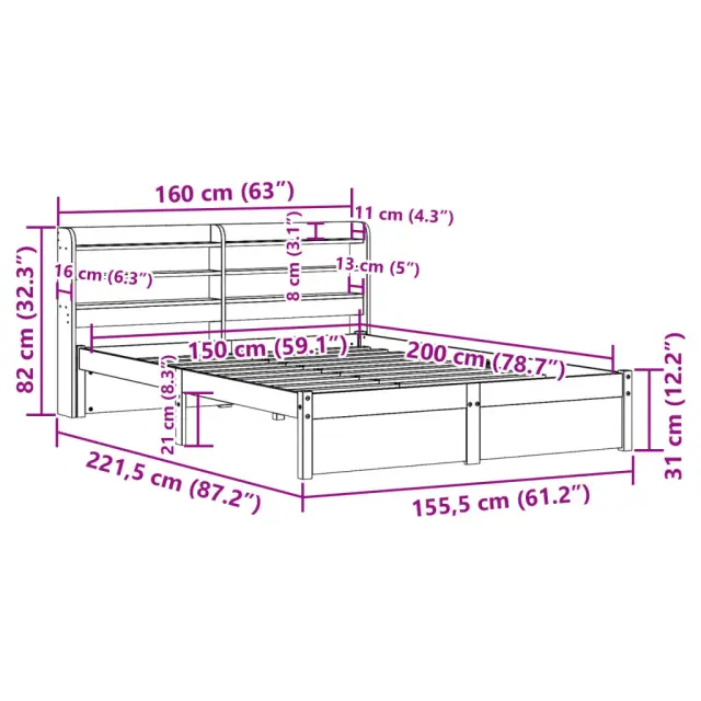 S tem lesenim posteljnim okvirjem lahko uživate v odličnem spancu! To je praktičen in dekorativen dodatek za vaše notranje prostore. Trdna borovina: Trdna borovina je čudovit naravni material. Borovina ima ravne vzorce, grče pa dajejo materialu njegov značilen, rustikalen videz.Močan posteljni okvir: Lesen okvir zagotavlja trdnost in stabilnost. Letvice iz vezanega lesa omogočajo dobro porazdelitev teže in zagotavljajo, da vzmetnica ostane na mestu ob vsakem zasuku in obračanju med spanjem.Vsestransko vzglavje: Ta posteljni okvir je opremljen z vzglavjem, ki zagotavlja odlično oporo hrbtu, ko sedite v postelji in berete ali gledate televizijo, hkrati pa služi tudi kot dekorativni element.Veliko prostora za shranjevanje: To elegantno vzglavje ima dve priročni polici, ki ponujata veliko prostora za shranjevanje, da bodo vaše večerne potrebščine na dosegu roke. Dobro je vedeti:Vzmetnica ni priložena tej postelji. Ponujamo različno izbiro ležišč. V naši trgovini si lahko ogledate ustrezne vzmetnice.Material posteljnega okvirja: Trdna borovina (neobdelana)Material letvic: Vezan lesCelotne dimenzije: 221,5 x 160 x 82 cm (D x Š x V)Velikost primerne vzmetnice: 150 x 200 cm (Š x D) (vzmetnica ni priložena)Dimenzije vzglavja: 160 x 16 x 82 cm (D x Š x V)S policami za shranjevanjePotrebno sestavljanje: DaPaket vsebuje:1 x Posteljni okvir1 x Vzglavje 3306738