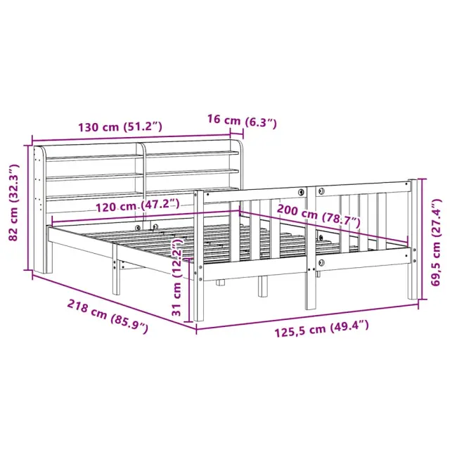 S tem lesenim posteljnim okvirjem lahko uživate v odličnem spancu! To je praktičen in dekorativen dodatek za vaše notranje prostore. Trdna borovina: Trdna borovina je čudovit naravni material. Borovina ima ravne vzorce, grče pa dajejo materialu njegov značilen, rustikalen videz.Močan posteljni okvir: Lesen okvir zagotavlja trdnost in stabilnost. Letvice iz vezanega lesa omogočajo dobro porazdelitev teže in zagotavljajo, da vzmetnica ostane na mestu ob vsakem zasuku in obračanju med spanjem.Funkcionalno vzglavje in podnožje: Vzglavje in podnožje lesene postelje ohranjata ležišče na mestu. Poleg tega vzglavje zagotavlja odlično oporo hrbtu, ko sedite v postelji in berete ali gledate televizijo.Veliko prostora za shranjevanje: To elegantno vzglavje ima dve priročni polici, ki ponujata veliko prostora za shranjevanje, da bodo vaše večerne potrebščine na dosegu roke. Dobro je vedeti:Vzmetnica ni priložena tej postelji. Ponujamo različno izbiro ležišč. V naši trgovini si lahko ogledate ustrezne vzmetnice.Material posteljnega okvirja: Trdna borovina (neobdelana)Material letvic: Vezan lesCelotne dimenzije: 218 x 130 x 82 cm (D x Š x V)Velikost primerne vzmetnice: 120 x 200 cm (Š x D) (vzmetnica ni priložena)Dimenzije vzglavja: 130 x 16 x 82 cm (D x Š x V)S policami za shranjevanjePotrebno sestavljanje: DaPaket vsebuje:1 x Posteljni okvir z vznožjem1 x Vzglavje 3306708