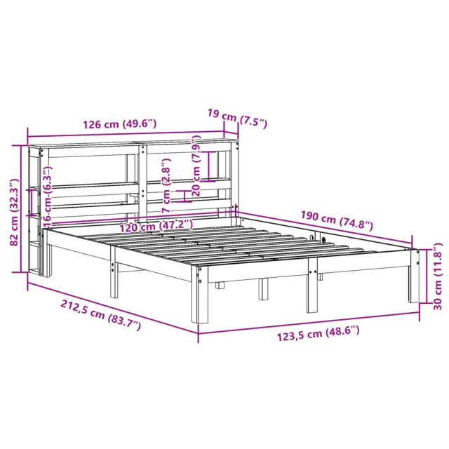 S tem lesenim posteljnim okvirjem lahko uživate v odličnem spancu! To je praktičen in dekorativen dodatek za vaše notranje prostore. Trdna borovina: Trdna borovina je čudovit naravni material. Borovina ima ravne vzorce, grče pa dajejo materialu njegov značilen, rustikalen videz.Letvice iz vezanega lesa: Letvice iz vezanega lesa zagotavljajo dobro porazdelitev teže, kar ležišču zagotavlja prepotrebno oporo in zračnost.Veliko prostora za shranjevanje: To elegantno posteljno vzglavje ima dve priročni polici, ki ponujata veliko prostora za shranjevanje, da bodo vaše večerne potrebščine na dosegu roke.Samostoječe vzglavje: Samostoječe vzglavje ponuja brezskrbno rešitev za enostavno postavitev in premikanje brez potrebe po vgradnji na steno. Dobro je vedeti: Vzmetnica ni priložena tej postelji. Ponujamo različno izbiro ležišč. V naši trgovini si lahko ogledate ustrezne vzmetnice.Material posteljnega okvirja: Trdna borovina (neobdelana)Material letvic: Vezan lesCelotne dimenzije: 212,5 x 126 x 82 cm (D x Š x V)Višina prostora pod posteljo: 21 cmVelikost primerne vzmetnice: 120 x 190 cm (Š x D) (vzmetnica ni priložena)S policami za shranjevanjePotrebno sestavljanje: Da 3306035