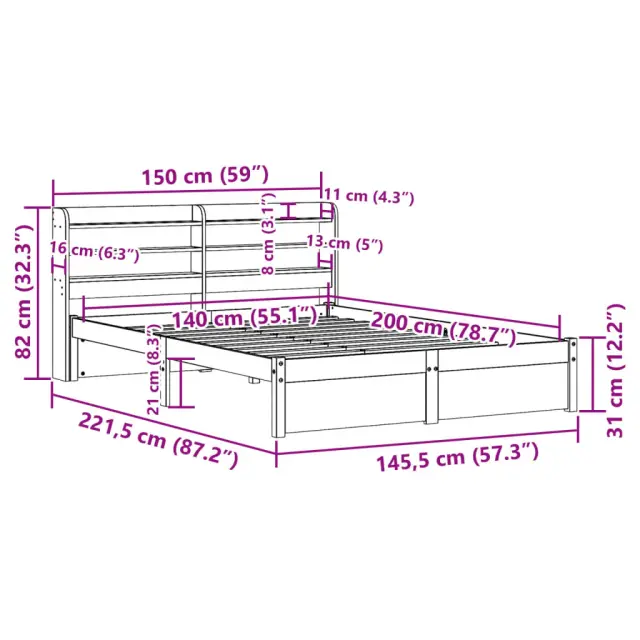 S tem lesenim posteljnim okvirjem lahko uživate v odličnem spancu! To je praktičen in dekorativen dodatek za vaše notranje prostore. Trdna borovina: Trdna borovina je čudovit naravni material. Borovina ima ravne vzorce, grče pa dajejo materialu njegov značilen, rustikalen videz.Močan posteljni okvir: Lesen okvir zagotavlja trdnost in stabilnost. Letvice iz vezanega lesa omogočajo dobro porazdelitev teže in zagotavljajo, da vzmetnica ostane na mestu ob vsakem zasuku in obračanju med spanjem.Vsestransko vzglavje: Ta posteljni okvir je opremljen z vzglavjem, ki zagotavlja odlično oporo hrbtu, ko sedite v postelji in berete ali gledate televizijo, hkrati pa služi tudi kot dekorativni element.Veliko prostora za shranjevanje: To elegantno vzglavje ima dve priročni polici, ki ponujata veliko prostora za shranjevanje, da bodo vaše večerne potrebščine na dosegu roke. Dobro je vedeti:Vzmetnica ni priložena tej postelji. Ponujamo različno izbiro ležišč. V naši trgovini si lahko ogledate ustrezne vzmetnice.Material posteljnega okvirja: Trdna borovina (neobdelana)Material letvic: Vezan lesCelotne dimenzije: 221,5 x 150 x 82 cm (D x Š x V)Velikost primerne vzmetnice: 140 x 200 cm (Š x D) (vzmetnica ni priložena)Dimenzije vzglavja: 150 x 16 x 82 cm (D x Š x V)S policami za shranjevanjePotrebno sestavljanje: DaPaket vsebuje:1 x Posteljni okvir1 x Vzglavje 3306736