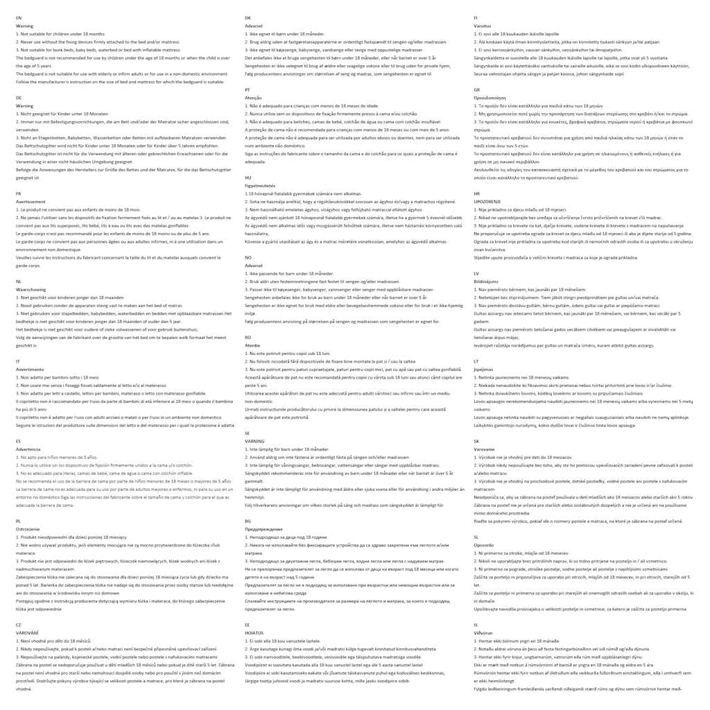 Zaščita za posteljo ni priporočljiva za uporabo pri otrocih, mlajših od 18 mesecev, in pri otrocih, starejših od 5 let. Zaščita za posteljo ni primerna za uporabo pri starejših ali onemoglih odraslih osebah ali za uporabo v okolju, ki ni domače; Upoštevajte navodila proizvajalca o velikosti postelje in vzmetnice, za katero je zaščita za posteljo primerna.