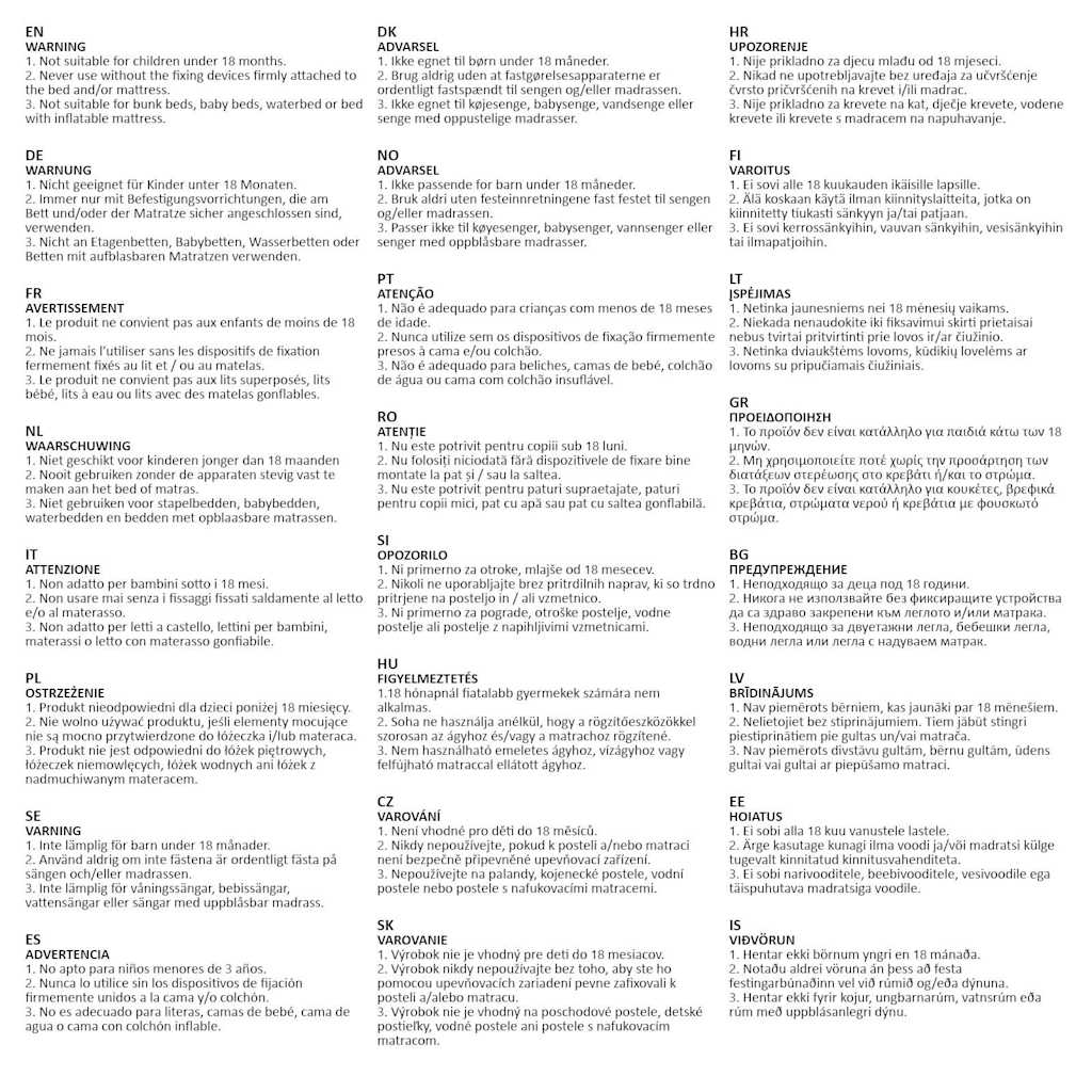 Zaščita za posteljo ni priporočljiva za uporabo pri otrocih, mlajših od 18 mesecev, in pri otrocih, starejših od 5 let. Zaščita za posteljo ni primerna za uporabo pri starejših ali onemoglih odraslih osebah ali za uporabo v okolju, ki ni domače; Upoštevajte navodila proizvajalca o velikosti postelje in vzmetnice, za katero je zaščita za posteljo primerna.