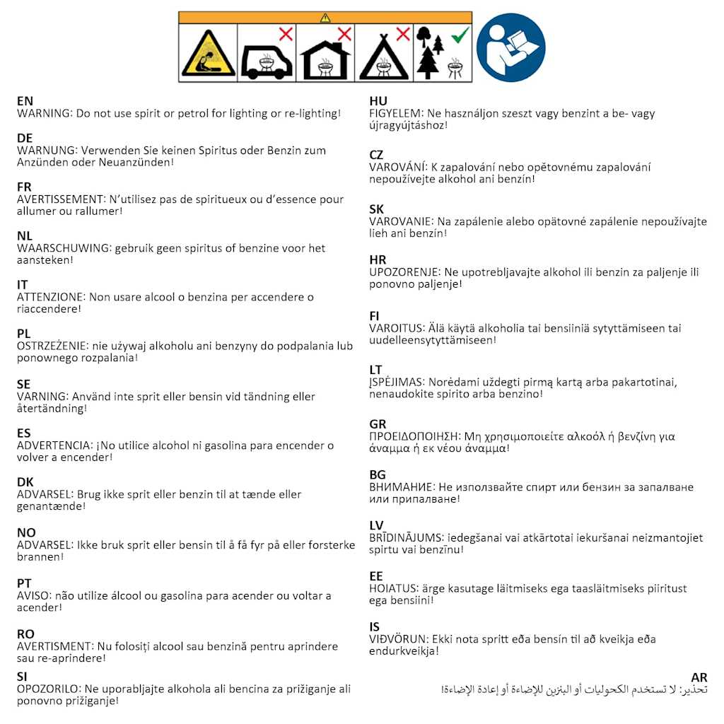 OPOZORILO: Ne uporabljajte alkohola ali bencina za prižiganje ali ponovno prižiganje!